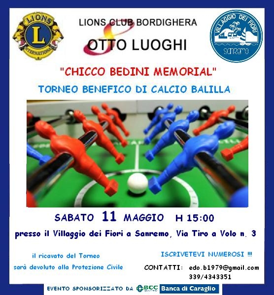 Sabato 11 maggio 2019 alle ore 15,00, presso il Villaggio dei Fiori di Sanremo, (Via Tiro a Volo n. 3) il Lions Club Bordighera Otto Luoghi organizza, in ricordo del Socio e Professore di educazione fisica Francesco “Chicco” Bedini, un torneo amatoriale di calcio balilla a scopo benefico.