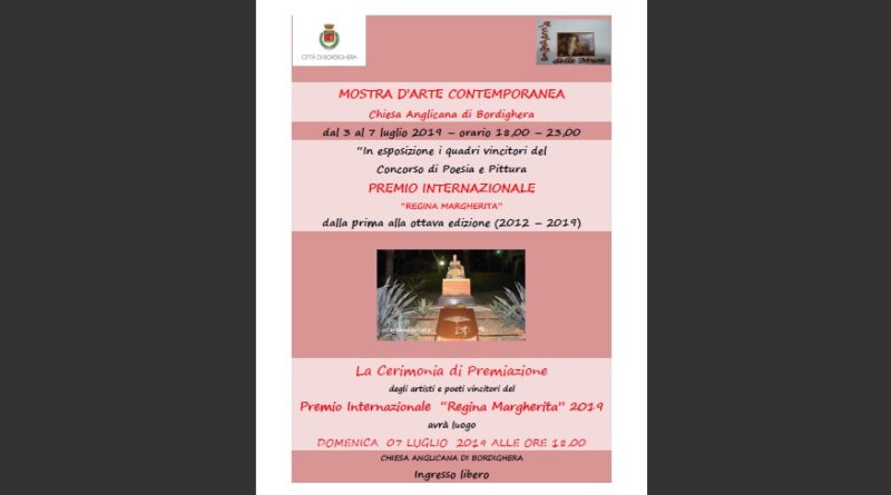 Da mercoledì 3 a domenica 7 luglio, Chiesa Anglicana, dalle 18.00 alle 23.00, l’Accademia Delle Muse di Bordighera, con il patrocinio del Comune di Bordighera, presenta: Mostra Arte Contemporanea/Poesia/Prosa/Artisti (vincitori edizioni precedenti) del Concorso “Premio Internazionale Regina Margherita”. La cerimonia di premiazione Artisti e poeti dell’ottava edizione 2019 – Premio Internazionale Poesia/Pittura “Regina Margherita” avrà luogo domenica 7 luglio 2019 alle ore 18,00 sempre in Chiesa Anglicana.