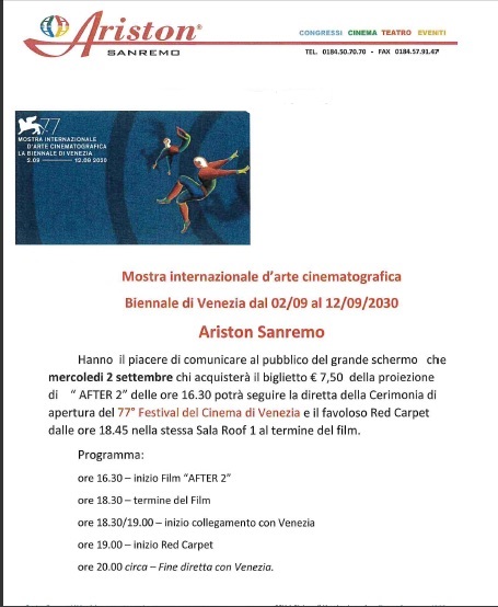 Altre Città Cinema Cultura Cultura News Sanremo DIRETTA DI APERTURA DEL 77° FESTIVAL DEL CINEMA DI VENEZIA AL TEATRO ARISTON DI SANREMO 31 Agosto 20202 Settembre 2020 admin Ariston Sanremo, Teatro Ariston La redazione