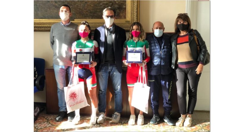 Nel pomeriggio di ieri, a Palazzo Garnier, il Sindaco Vittorio Ingenito e gli Assessori Melina Rodà e Stefano Gnutti hanno incontrato due giovani promesse della Ciclistica Bordighera per congratularsi per gli importanti successi ottenuti negli ultimi mesi. Le atlete, cui è stata donata una targa, sono Lucia Brillante Romeo e Beatrice Temperoni; erano presenti anche il presidente ed allenatore Guerino Lanzo e l’allenatore Stefano Brillante.