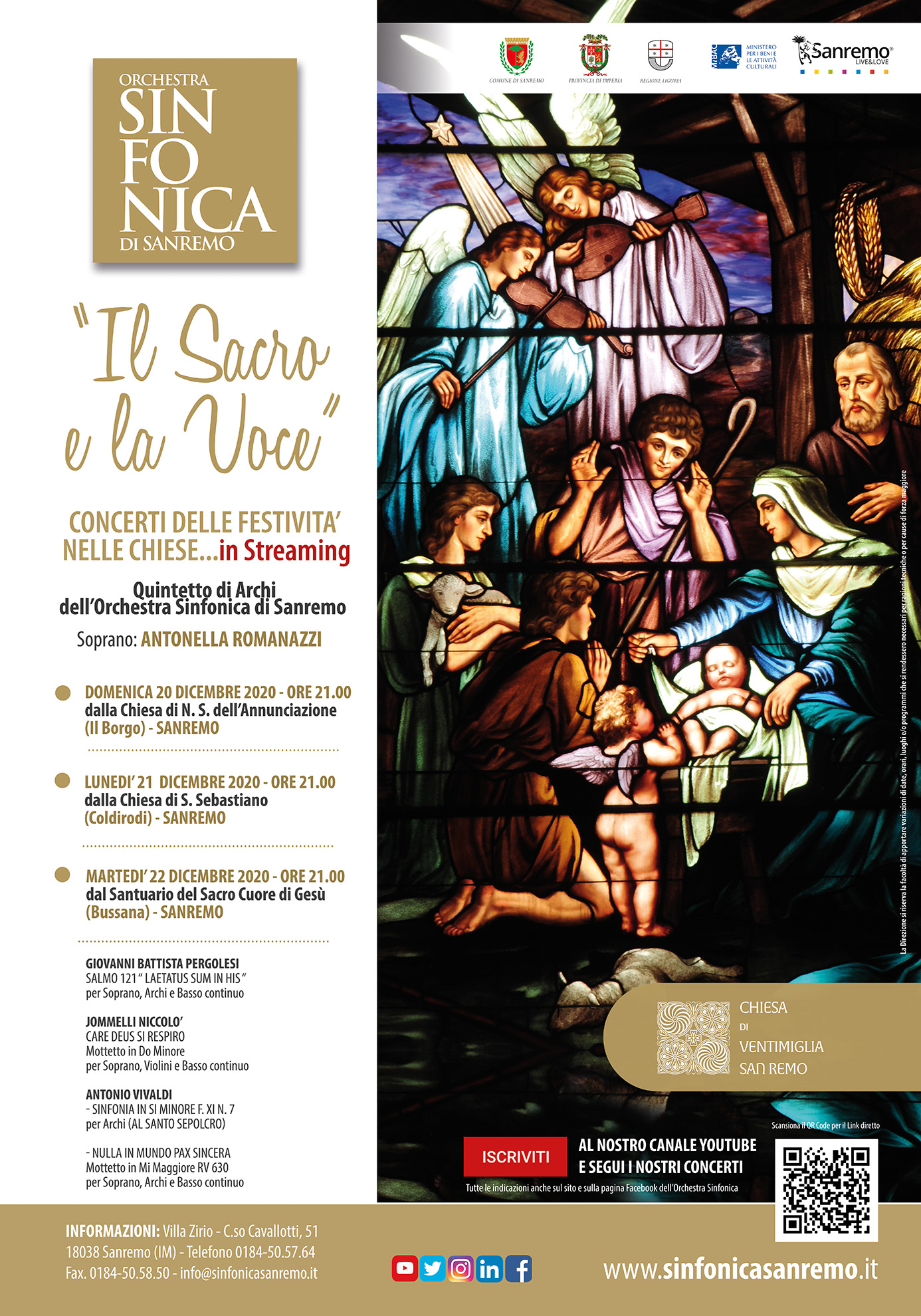 Per manifestare comunque la vicinanza dell’Orchestra Sinfonica di Sanremo, dell’Amministrazione Comunale e della Curia Vescovile, soprattutto in questo periodo di festività , abbiamo scelto di realizzare in ogni caso le esecuzioni nelle sedi indicate senza, però, consentire l’accesso al pubblico.