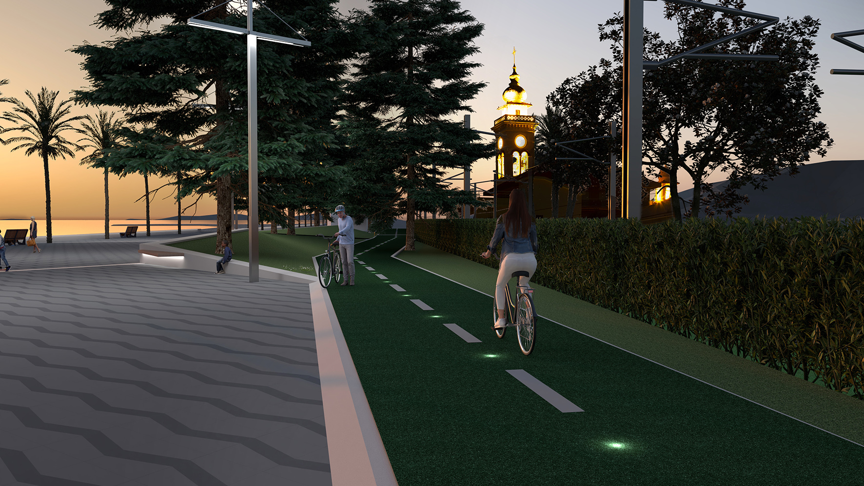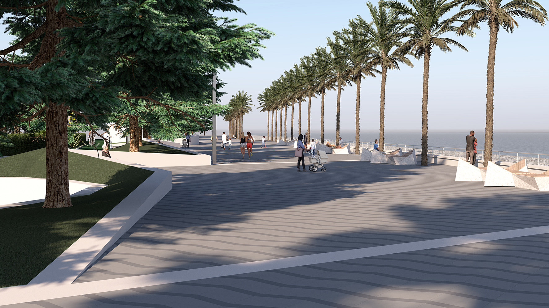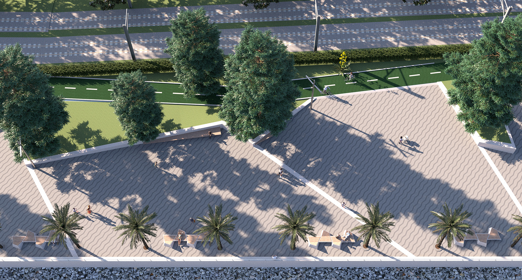 La stessa piantumazione di nuove palme del genere Dactilifera lato mare, area occupata allo stato attuale dalla sola distesa di asfalto, asseconda questa labilità del confine tra percorso e giardino, a tutto vantaggio della fruizione globale dello spazio pubblico.