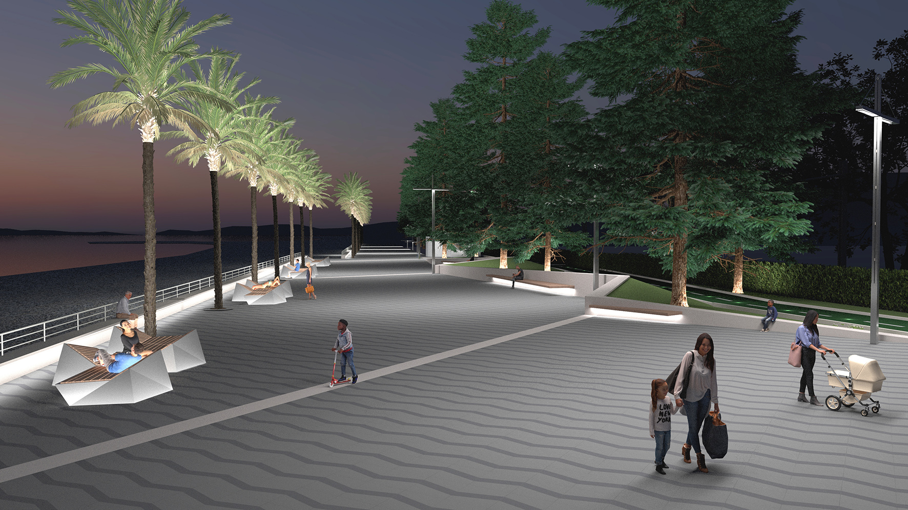 Nel progetto il disegno della pavimentazione (differenziato con strisce in pietra della lessinia bianca), della luce e delle alberature ritma il percorso della passeggiata -oggi indifferenziato- e rivela i punti focali come gli spazi di socializzazione e di interesse artistico (la collocazione delle opere d’arte o il chiosco della Musica), gli innesti dei sottopassaggi, gli accessi agli stabilimenti balneari ecc…