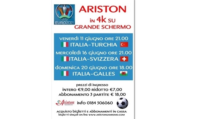 Si comunica che, l’Ariston proietterà in diretta le partite dell’Italia agli Europei di Calcio per la prima volta in 4K su grande schermo .