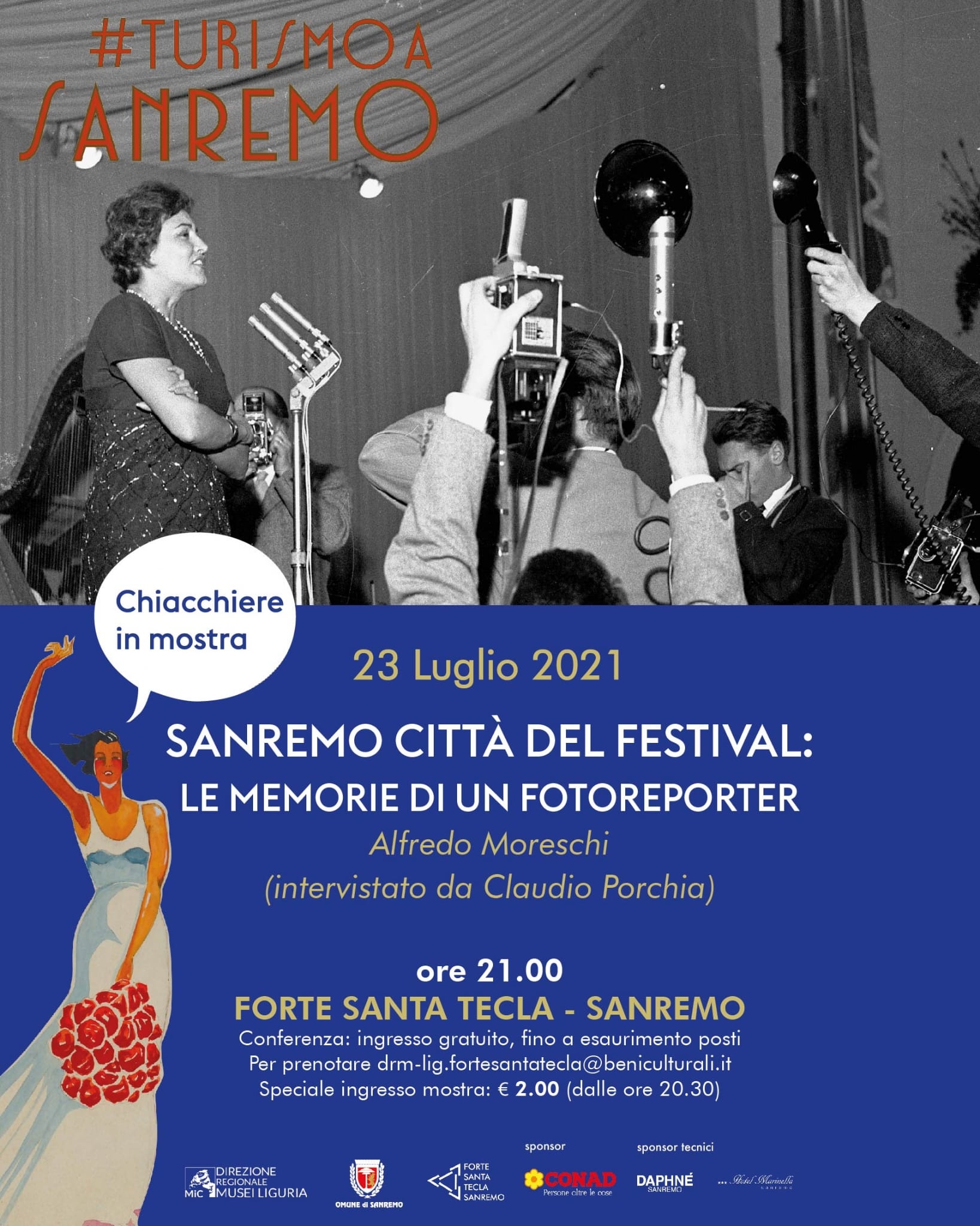 Dal 16 luglio al 27 agosto sei serate di incontri al Forte Santa Tecla in occasione della mostra #turismoasanremo. Venerdì 23 luglio il secondo appuntamento è dedicato a Sanremo città del Festival: le memorie di un fotoreporter conAlfredo Moreschi, storico fotografo sanremese, intervistato dal giornalista Claudio Porchia. Una serata di aneddoti e storie: un tuffo nei ricordi di chi ha documentato e raccontato il Festival con le sue immagini, molte delle quali arricchiscono la mostra.