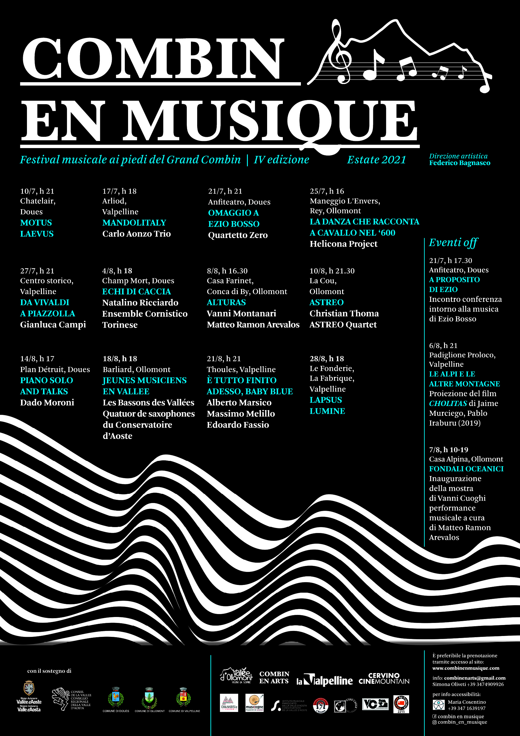 La kermesse Combin en Musique è ideata e curata dall’associazione culturale Combin en Arts, realizzata col sostegno del Consiglio Valle, dell’Assessorato regionale dei Beni Culturali, Turismo, Sport e Commercio e dei Comuni di Doues, Ollomont e Valpelline.