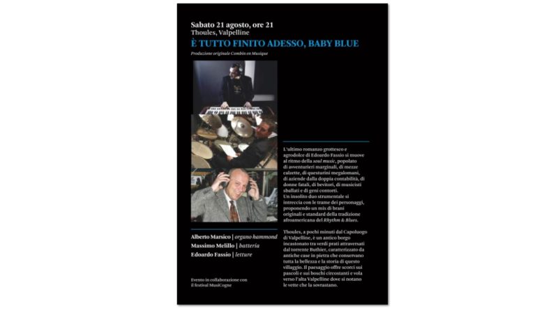 È TUTTO FINITO ADESSO, BABY BLUE dà spettacolo sabato 21 agosto, ore 21, a Thoules, Valpelline, Combin en Musique propone un concerto sui generis. Molti conoscono la formula dell’organ trio, un complesso formato da tre strumentisti – un organista e un batterista ai quali si aggiunge un terzo solista, di solito dedito al sax o alla chitarra, ma pure alla tromba, al vibrafono o al flauto. Il modello rende onore a quella variante cameristica e un po’ underground che prese piede alla fine degli anni 1950 tra sedimenti di jazz club e groove da oratorio battista. Il suo respiro richiama sentori di blues, gospel, funk e soul. Questa volta lo strumento solista è un’opera letteraria, È tutto finito adesso, Baby Blue (96, Rue de-La-Fontaine Edizioni), le sue atmosfere, le sue ambientazioni e i suoi personaggi, in particolare colei che dà il titolo al romanzo, la soul star per caso Linda “Baby Blue” Warren. La storia, che attraversa tre decenni e tre ambientazioni geografiche, esordisce in era thatcheriana in un’immaginaria cittadina del Nord dell’Inghilterra, insegue in Texas l’elusivo sogno americano e culmina in una Torino operaia, apparentemente anonima, impalpabile e immutabile.