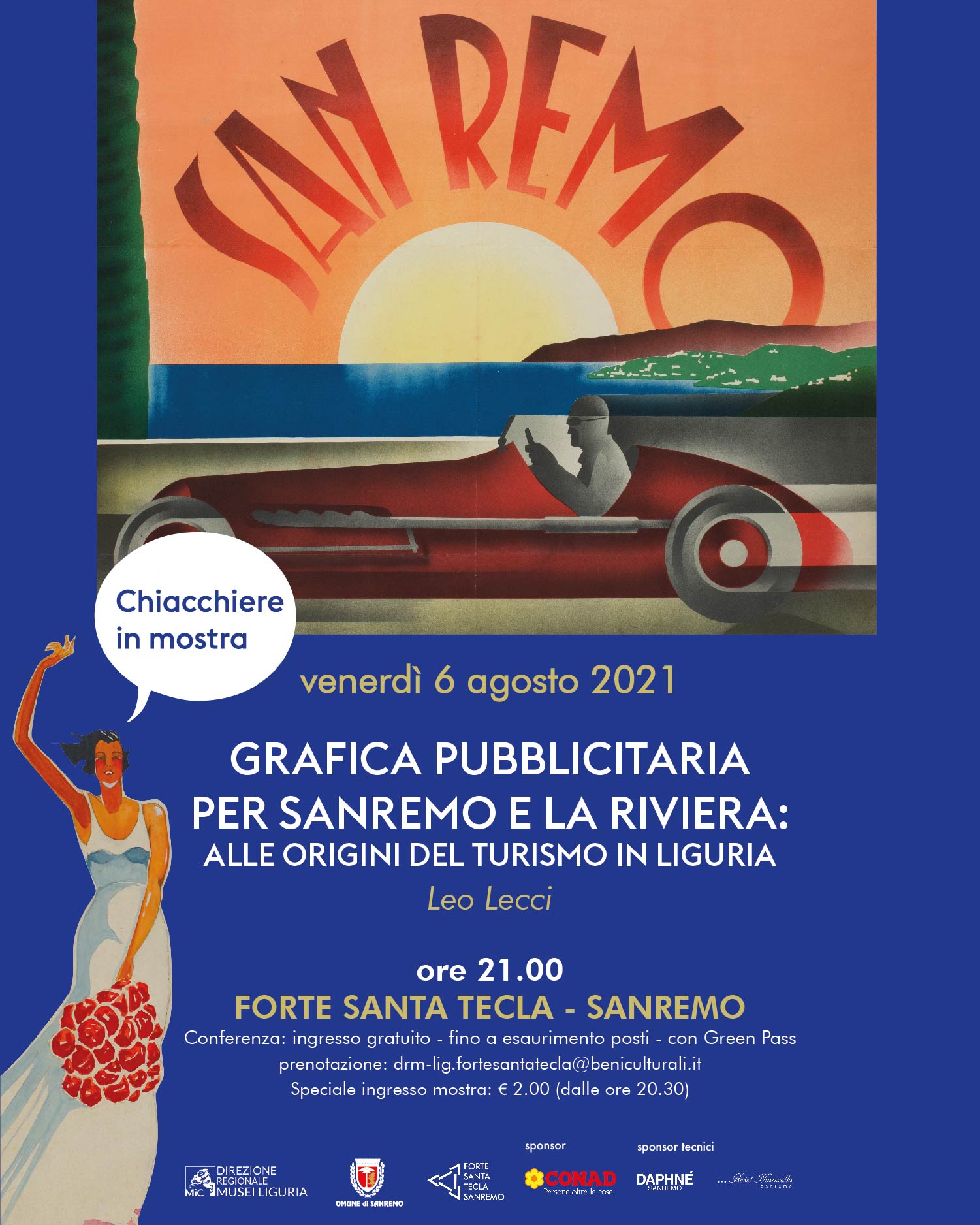 Dal 16 luglio al 27 agosto sei serate di incontri al Forte Santa Tecla in occasione della mostra #turismoasanremo. Il 6 agosto la serata sarà dedicata alla Grafica pubblicitaria per Sanremo e la Riviera: alle origini del turismo in Liguria con Leo Lecci, docente di Storia dell’arte contemporanea all’Università di Genova. Un viaggio alla scoperta dei manifesti in mostra e dei loro illustratori, attraverso le straordinarie immagini create per la promozione della città.