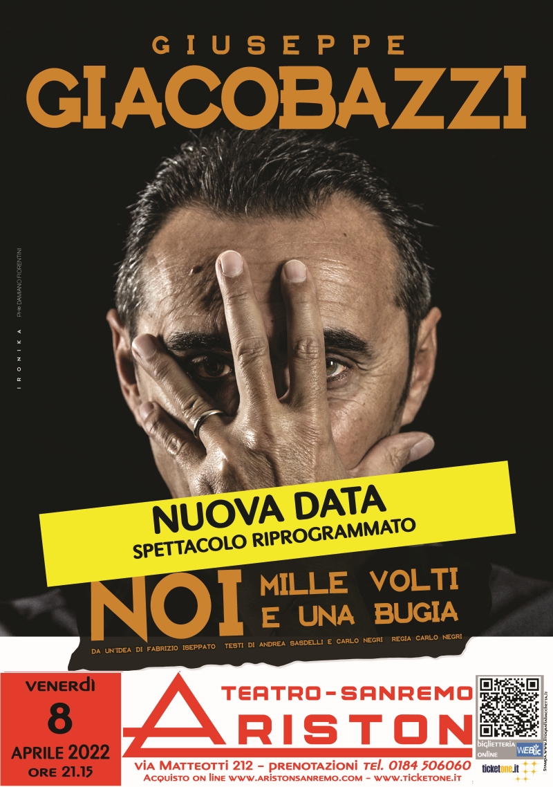 La produzione dello spettacolo di Giuseppe Giacobazzi “Noi, mille volti e una bugia”, originariamente in programma il 2/5/2020 e rinviato al 30/10/2021, comunica, che per motivi organizzativi, lo spettacolo viene rimandato a venerdì 8 aprile 2022.