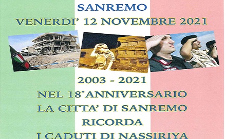 Alle 17, al Monumento ai Caduti di Nassiriya di via Nino Bixio, sono previste la cerimonia in onore dei Caduti e la deposizione di una corona di alloro offerta dal Lions Club Sanremo Host.