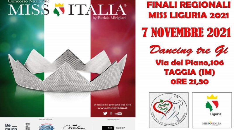 Anche la nostra Regione si appresta ad eleggere la sua Miss Liguria 2021. Domenica 07 novembre alle 21.30 c/o il “ Dancing Tre Gi “ di Taggia, la vincitrice accedera’ alle Pre-finali e Finali Nazionali di Miss Italia 2021 che si svolgeranno a Mestre e Venezia nel mese di Dicembre.