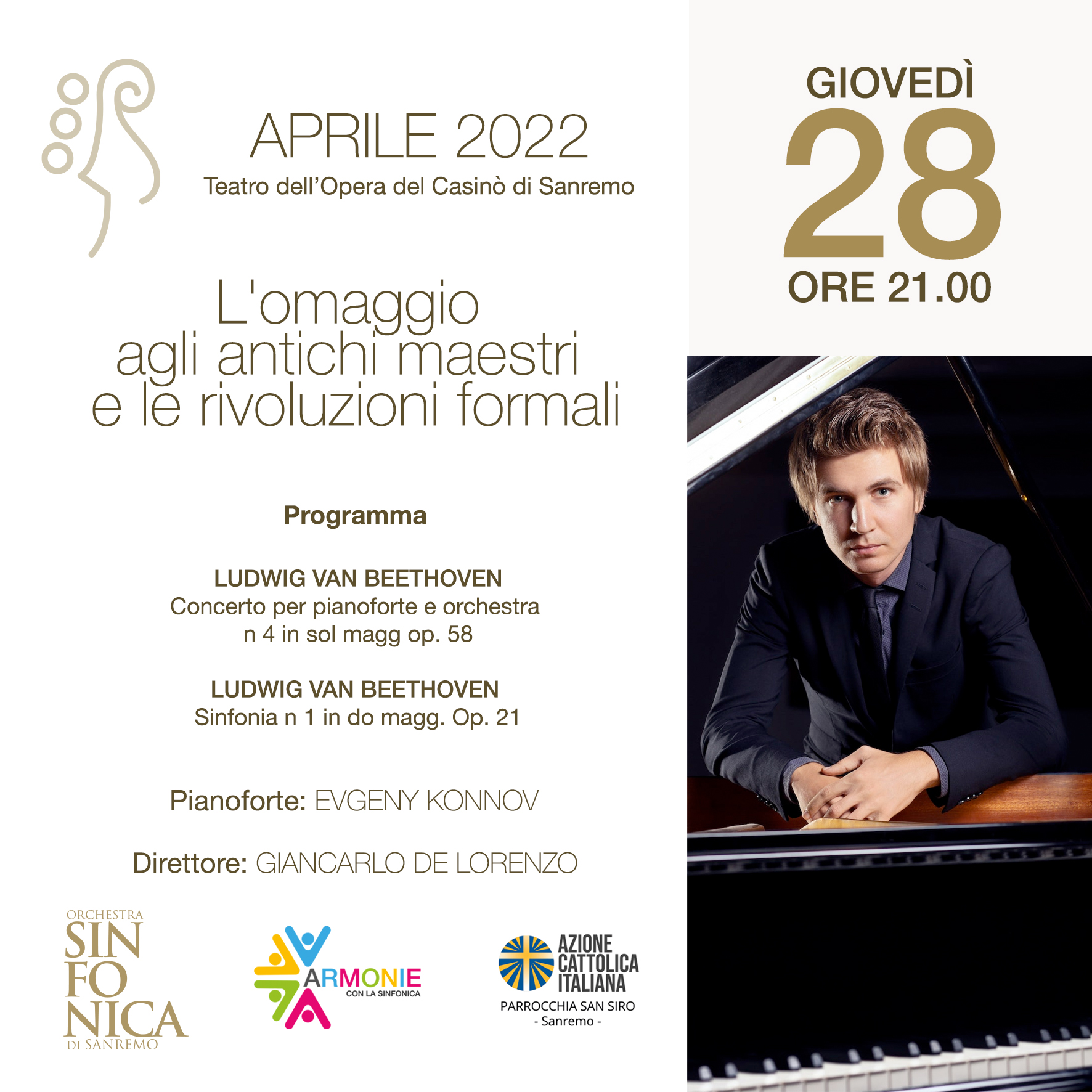 Nel primo appuntamento – giovedì 28 aprile alle 21.00 presso il Teatro dell’Opera del Casinò di Sanremo – per il concerto “L’omaggio agli antichi Maestri e le rivoluzioni formali”, l’Orchestra diretta dal Maestro Giancarlo De Lorenzo proporrà due brani di Ludwig van Beethoven che saranno eseguiti insieme allo straordinario pianista Evgeny Konnov.