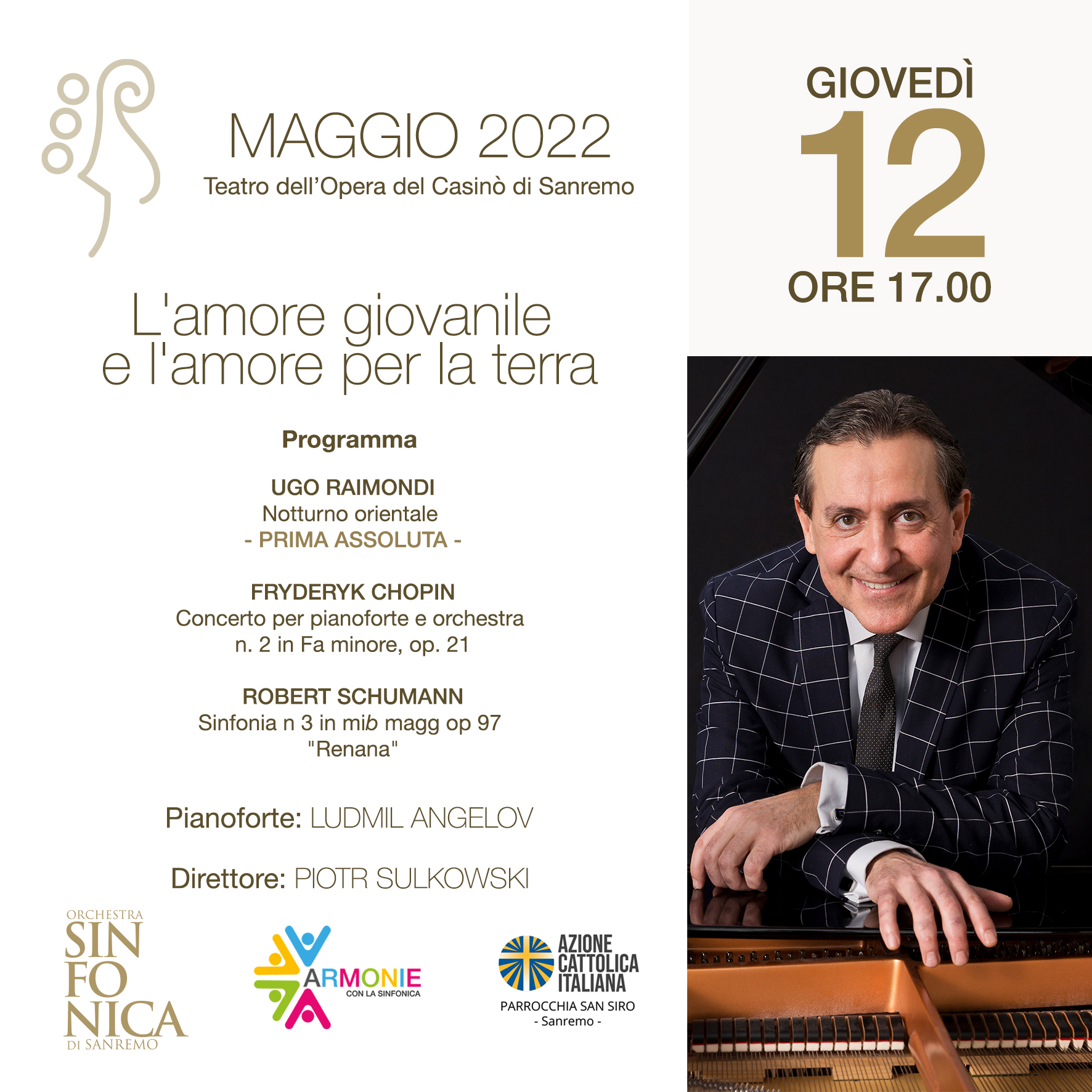 Dopo il successo dello scorso sabato sera, l’Orchestra Sinfonica di Sanremo tornaal Teatro dell’Opera del Casinò per un concerto pomeridiano. Giovedì 12 maggio alle 17.00 andrà in scena “L’AMORE GIOVANILE E L’AMORE PER LA TERRA” .