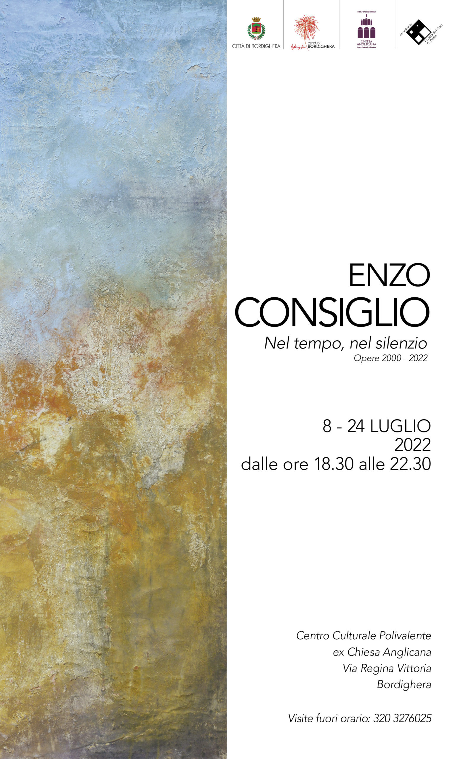 “Sono particolarmente lieto che la prima mostra d’arte ospitata nell’ex Chiesa Anglicana dopo l’importante restauro veda protagonista Enzo Consiglio, un artista profondamente legato a Bordighera e vero protagonista del suo tessuto culturale.” ha commentato il Sindaco Ingenito. “È un piacere aver contribuito all’organizzazione di questo prestigioso evento: grazie al maestro per aver accolto il nostro invito”.​