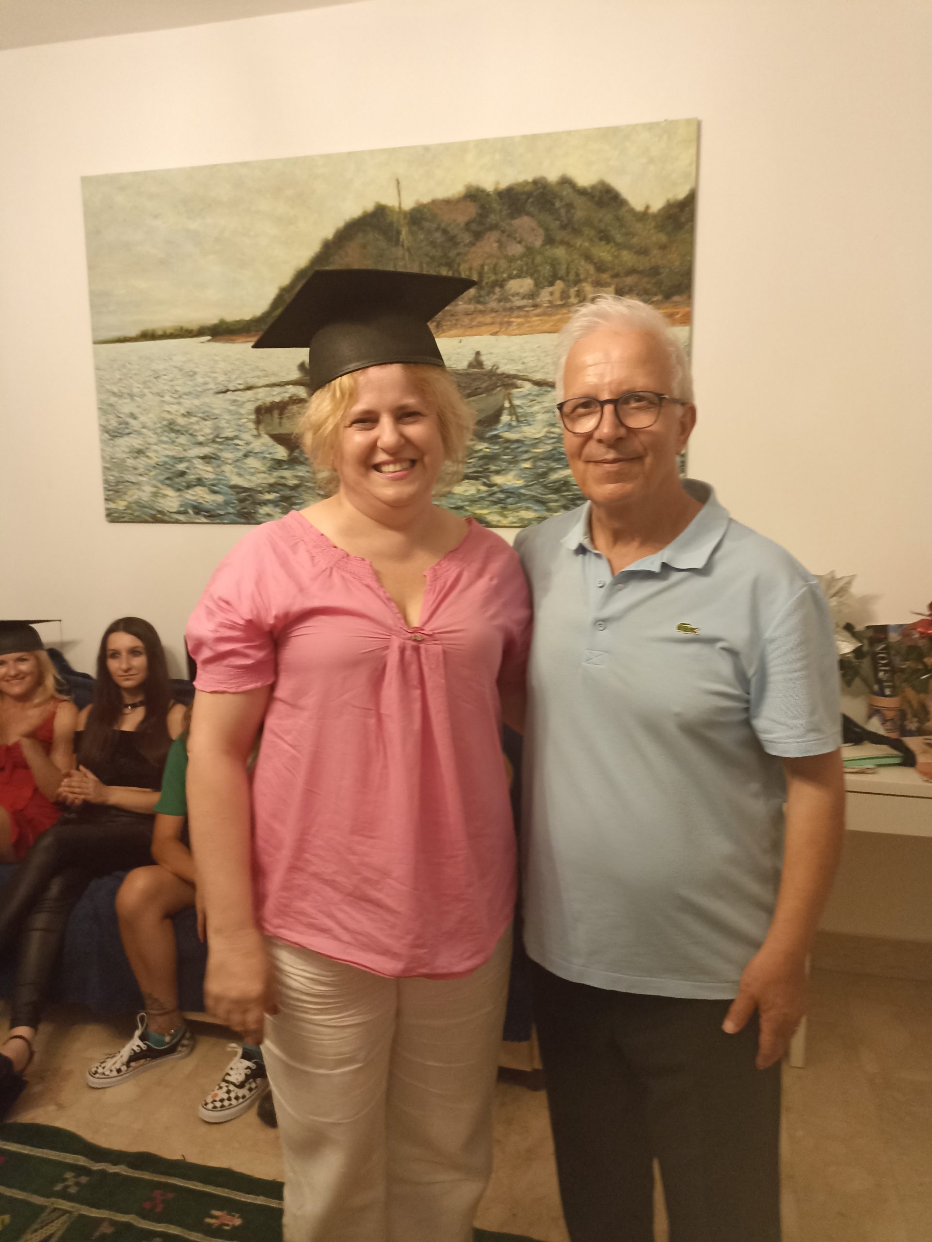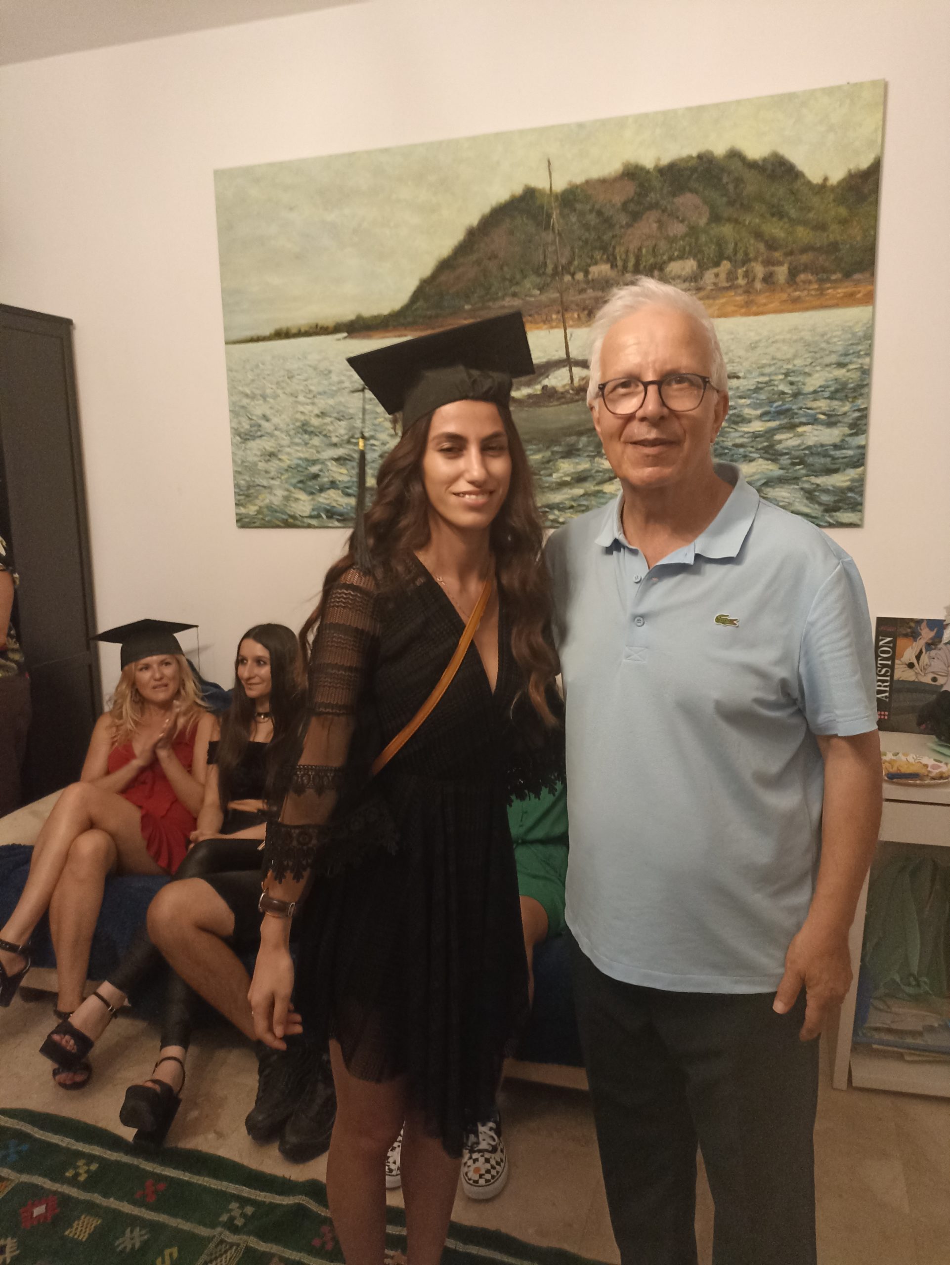Luca Lo Faro studente marito di Sara: “ Al termine del nostro percorso, tutta la classe è stata invitata dalla nostra cara prof.ssa Francesca Rotta Gentile e dal corpo docente della classe a partecipare a una cena nella magnifica terrazza di casa sua e qui abbiamo avuto splendide sorprese. Infatti durante la cena, era presente anche il poeta libanese Hafez Haidar candidato Nobel per la Pace e la letteratura! E lui in persona, ci ha consegnato il Tocco alla presenza di tutti i nostri docenti, e anche del personale Ata rappresentato dallo storico e insostituibile Salvatore. Fortissime e indimenticabili emozioni. Un grosso e caloroso ringraziamento alla prof.ssa Francesca Rotta Gentile coordinatrice e anima del corso serale , alla prof.ssa di economia Giuseppina Lombardi, anche la seconda prova di economia è andata mediamente molto bene, al prof. di matematica Salvatore Fruet, alla prof. di diritto Raffaella Del Zio, al prof. di inglese Stefano Mulas, alla prof.ssa di francese Viviana Strano, davvero docenti e soprattutto persone uniche che ci hanno saputo accompagnare egregiamente in questi due anni delicati, superando anche le difficoltà della pandemia