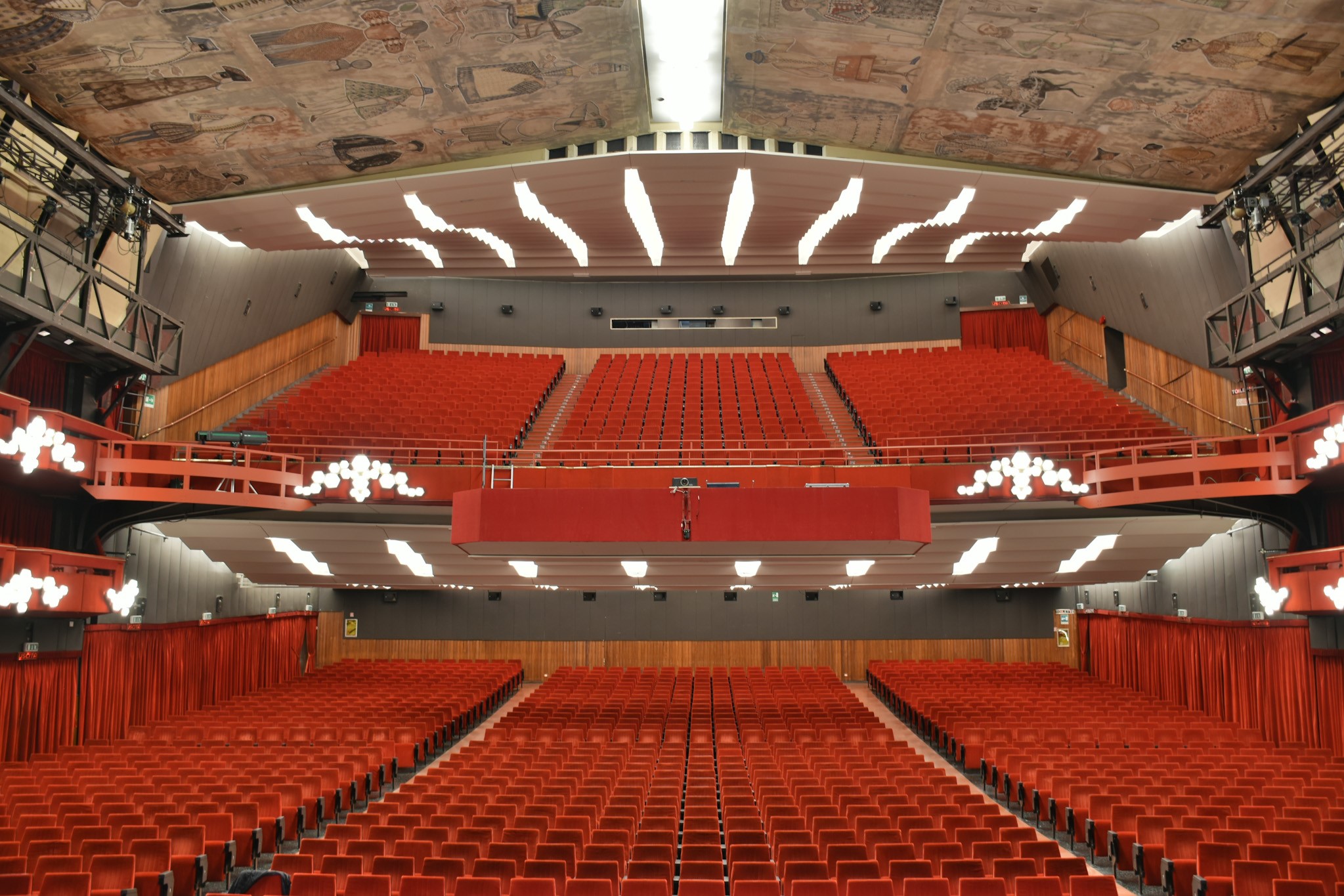 Ogni parete e perfino le colonne e i soffitti dell’edificio ospitano oggetti d’arte. Sculture anni Sessanta di Nerone Ceccarelli, affreschi di Antonio Rubino, le formelle che Emanuele Luzzati aveva creato per l’Andrea Doria. Un’aria da transatlantico dello spettacolo che si respira a pieni polmoni quando si lascia il Roof per seguire il filo conduttore della mostra sulla terrazza coperta dalle nuove sale, fra gigantografie di Pippo Baudo, di Celentano, di un giovanissimo Fabio Fazio con Laetitia Casta, le immagini del Tenco. Uno sguardo sulla città come dal ponte di una nave. I pilastri di ferro sostengono la sala stampa appoggiata su pavimenti d’epoca. È così che devono sentirsi i cantanti, a febbraio: passeggeri di prima classe a bordo di un evento d’eccezione.