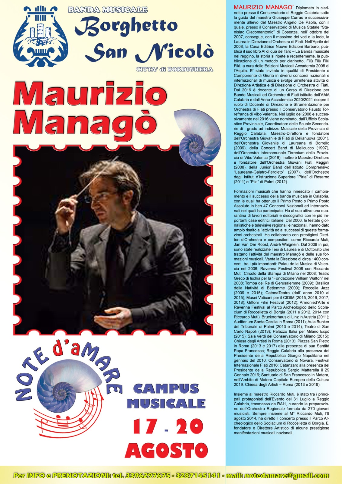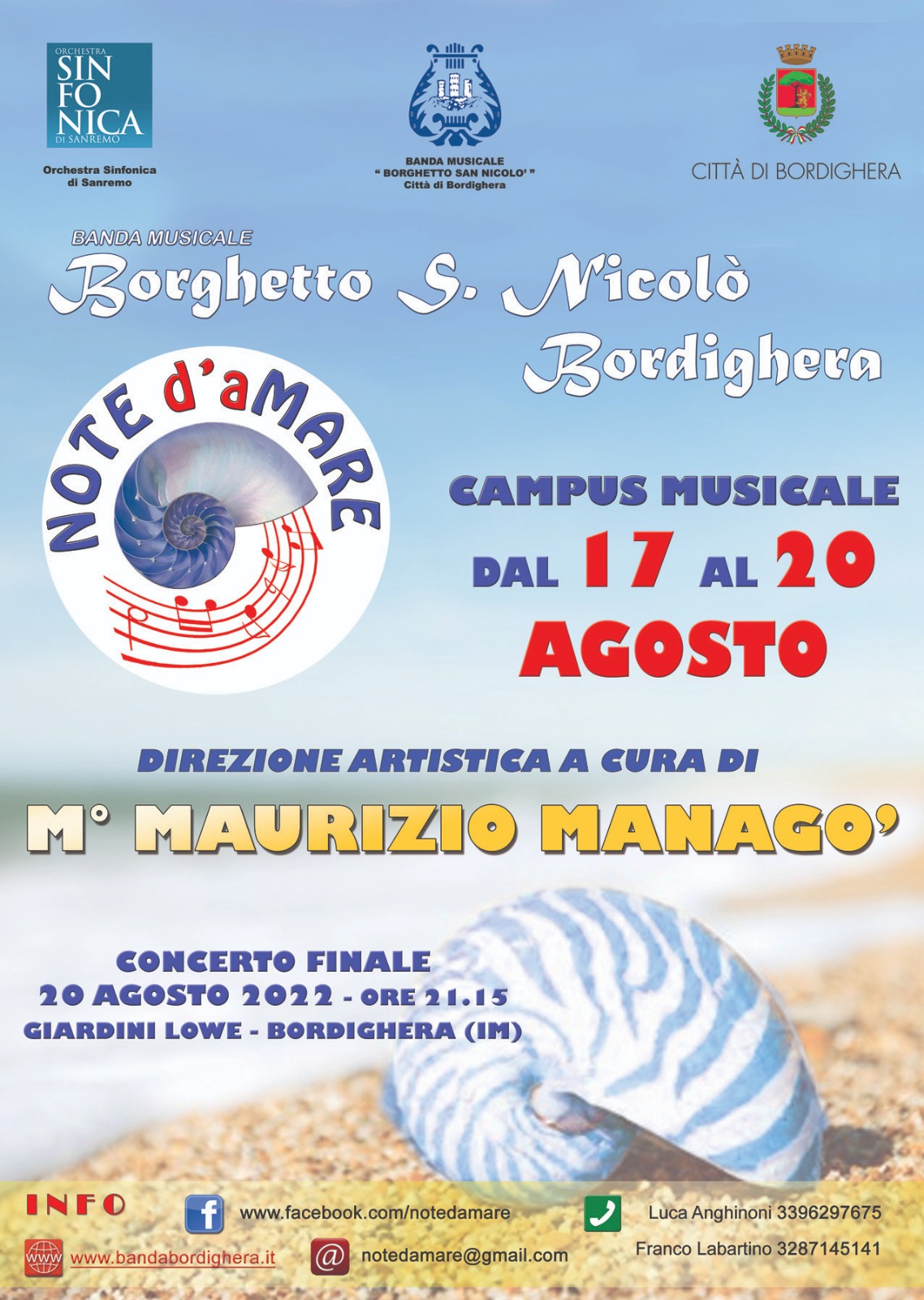 Torna dal 17 al 20 agosto il campus Note d’aMare a cura della Banda Musicale Borghetto San Nicolò Città di Bordighera, dedicato a coloro che desiderano arricchire la loro esperienza musicale condividendo il piacere di imparare e suonare insieme. Quest’anno la direzione artistica è del Maestro Maurizio Managò, direttore di banda e docente del Conservatorio di Vibo Valentia. Il Maestro Managò si è distinto nella sua terra non solo come musicista, vincendo numerosi riconoscimenti in Italia e all’estero, ma anche come esempio positivo in un territorio contraddistinto da complesse realtà sociali.
