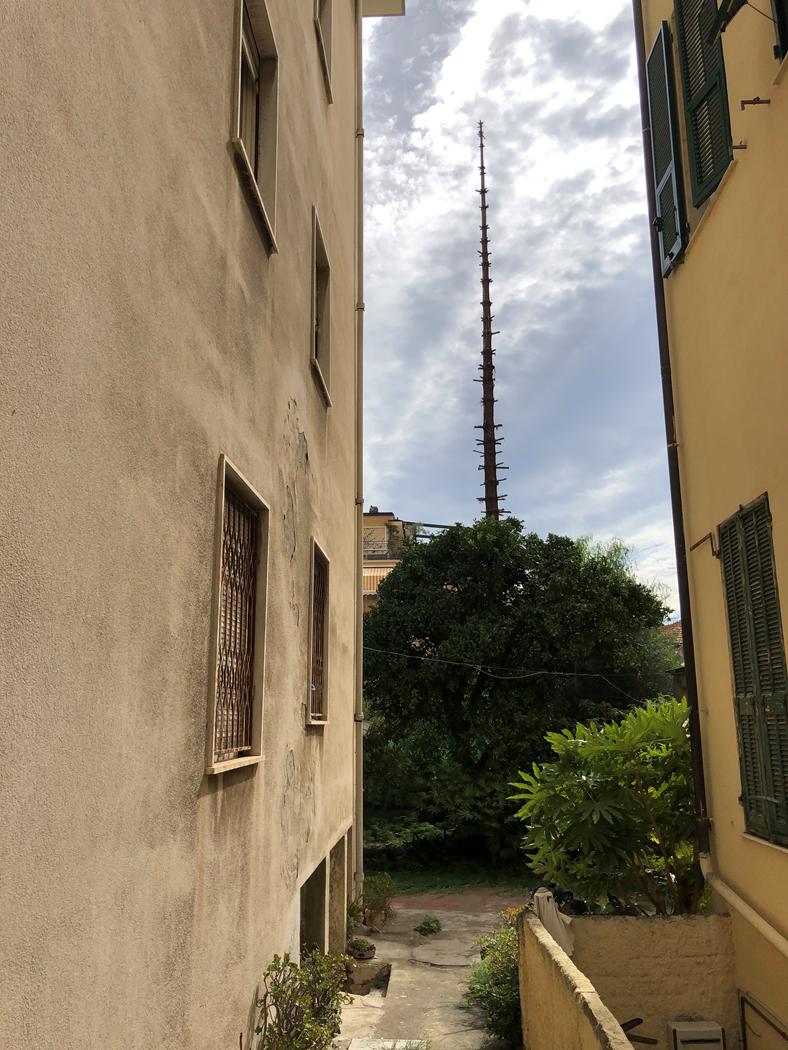 Le due fotografie allegate mostrano il tronco nudo di due Araucarie in giardini privati, una visibile dalla Piazzetta della Maddalena nel centro storico guardando a Nord, l’altra da Corso Italia in un’apertura tra i numeri civici 80 e 84. Stiamo seguendo questi alberi da 8 mesi chiedendoci se avrebbero avuto un’opportunita` di riprendersi dopo la potatura estrema. Li vediamo sempre piu’ sofferenti, a verifica del fatto che quella potatura non avrebbe mai dovuto succedere perche’ le Araucarie sono alberi che non si potano.