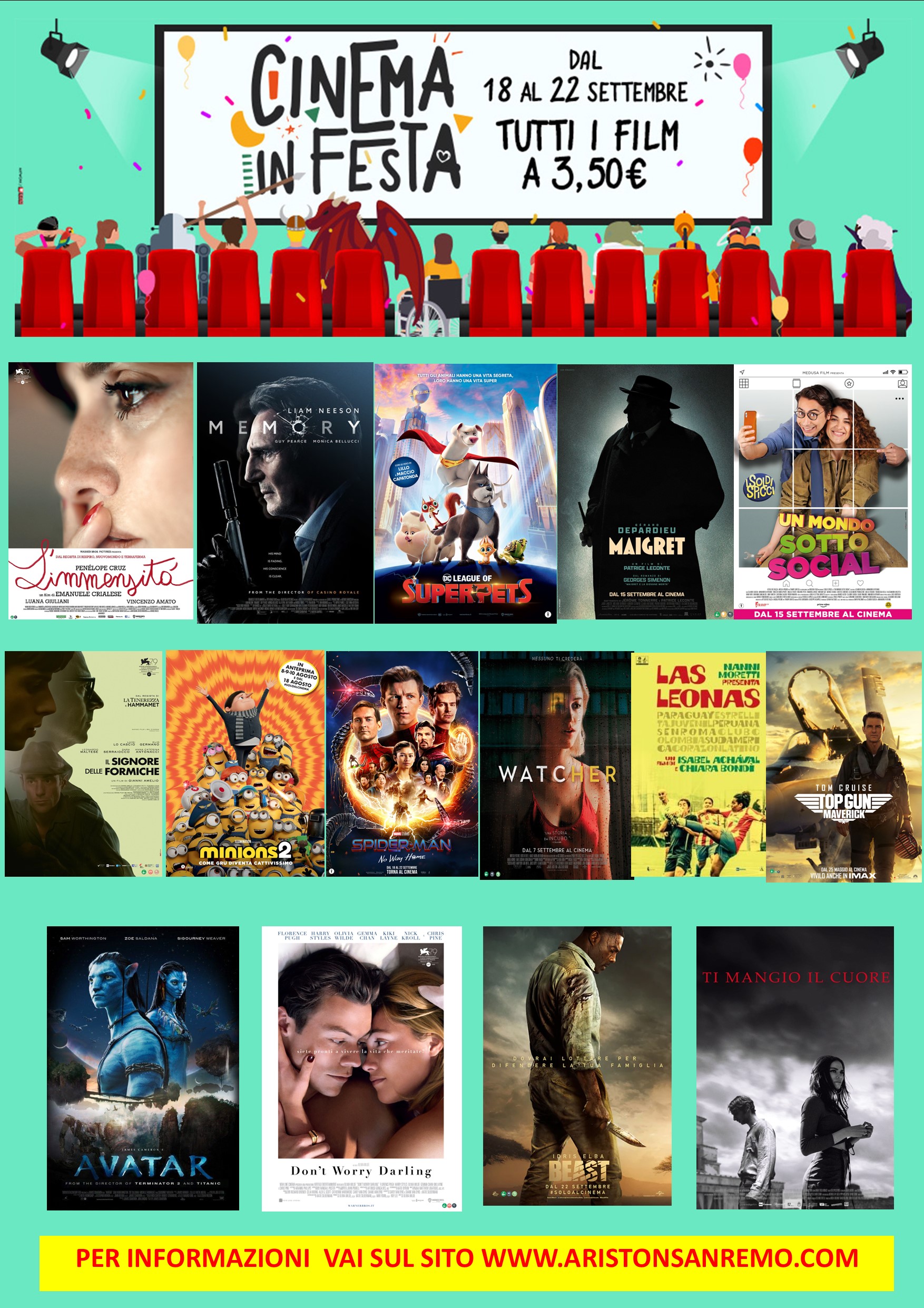 Nelle sale verranno proiettati i film in uscita ed eventuali anteprime al favoloso prezzo di € 3,50, per approfittare dello spettacolare evento consultate il nostro sito www.aristonsanremo.com sul quale troverete i film in programmazione nelle giornate dedicate al “CINEMA IN FESTA”