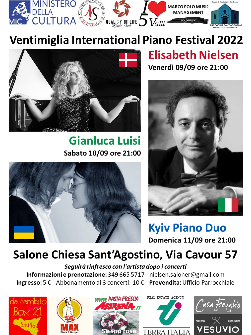 Saranno Elisabeth Nielsen (Danimarca), Gianluca Luisi (Italia), Kyiv Piano Duo (Ucraina) ad esibirsi sul fantastico e iconico gran piano Pleyel del 1928 che troneggia nella Sala Polivalente del chiostro della chiesta (degli eremitiani) di Sant’Agostino in via Cavour n. 57 a Ventimiglia (IM).