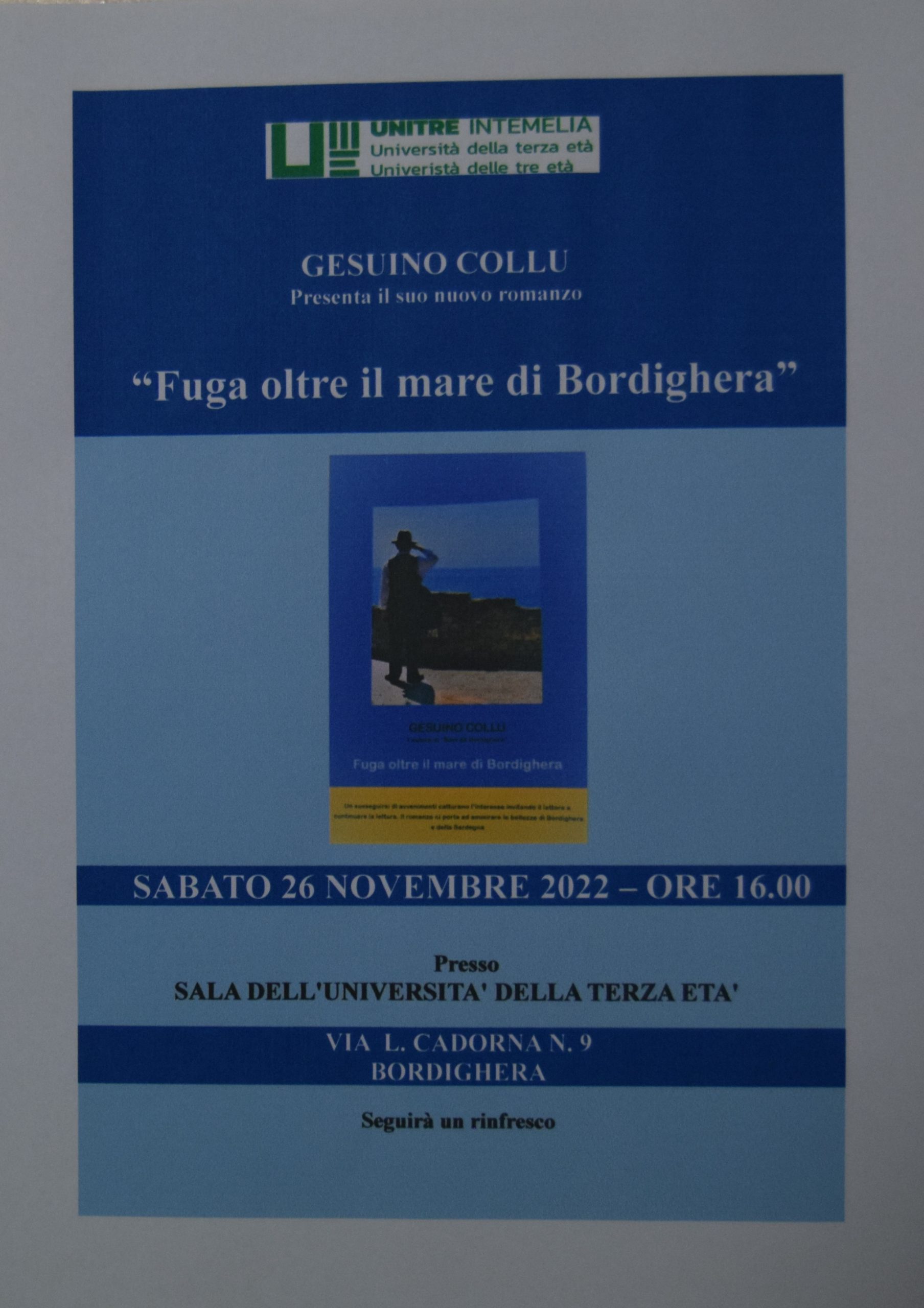 Sabato 26 novembre 2022 alle ore 16.00 presso la sala dell’UNIVERSITA’ DELLA TERZA ETA’ in VIA L. CADORNA N.9 a BORDIGHERA, l’autore presenta il suo nuovo romanzo “FUGA OLTRE IL MARE DI BORDIGHERA”.