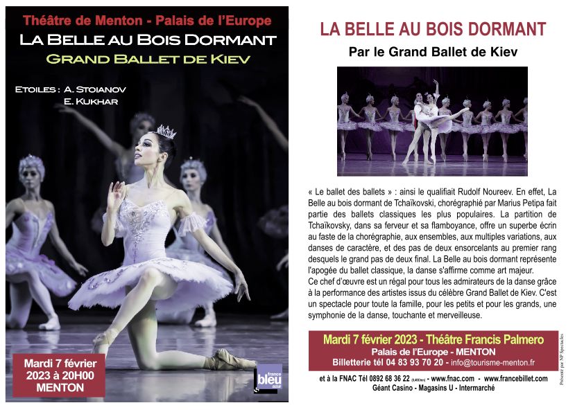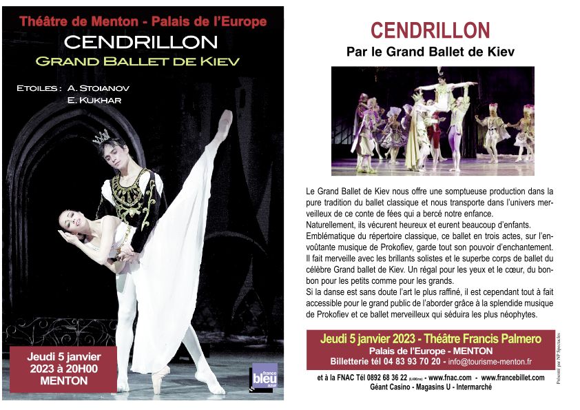 Al Teatro Francis Palmero, sito nel Palazzo d'Europa a Menton, si potrà assistere al primo spettacolo di danza : - CINDERELLA del Grand Ballet of kyiv in data 5 Gennaio 2023 alle ore 20 a cui faranno seguito - LA BELLA ADDORMENTATA del Grand Ballet of kyiv: martedì 7 febbraio ore 20 - BALLETTO NAZIONALE POLONIA: martedì 28 marzo 2023ore 20 Alleghiamo nel dettaglio notizie relative ai suddetti balletti per coloro che vogliono saperne di più.
