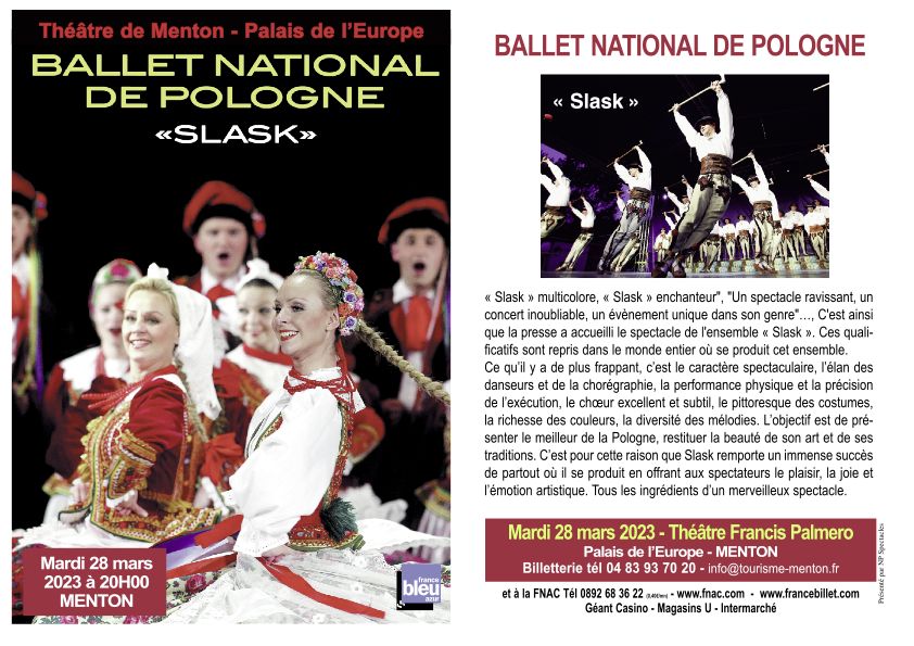 “Slask” Direction: Jerzy Wojcik 50 artistes – 2H10 avec entracte « Slask » multicolore, « Slask » enchanteur”, “Un spectacle ravissant, un concert inoubliable, un évènement unique dans son genre”…, C’est ainsi que la presse a accueilli le premier spectacle de l’ensemble « Slask ». Ces qualificatifs sont repris dans le monde entier où se produit cet ensemble. Slask popularise le folklore polonais, en présentant les chants et les danses de toutes les régions de la Pologne et en particulier des régions du sud. Ce qu’il y a de plus frappant, c’est le caractère spectaculaire, l’élan des danseurs et de la chorégraphie elle-même, la performance physique et la précision de l’exécution, le chœur excellent et subtil, le pittoresque des costumes, la richesse des couleurs, les tissus, les combinaisons de couleurs… et la diversité des mélodies. La formation artistique de ces artistes est d’un niveau très élevé, chacun d’entre eux fait l’objet d’une sélection drastique au sein de toutes les régions de la Pologne. L’objectif est de présenter le meilleur de la Pologne et de restituer la beauté de son art et de ses traditions. C’est pour cette raison que Slask remporte un immense succès de partout où il se produit en offrant aux spectateurs le plaisir, la joie et l’émotion artistique. Tous les ingrédients d’un merveilleux spectacle.