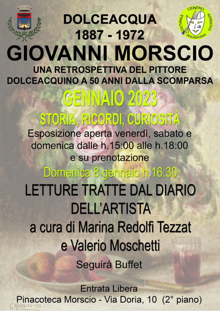 Domenica 8 Gennaio alle ore 16:30 in occasione della chiusura della mostra dedicata al pittore di Dolceacqua Giovanni Morscio (di cui ricorreva lo scorso luglio il cinquantesimo della sua morte) si svolgerà un incontro recitato con brani estrapolati dai diari dell’artista, scritti a partire dal 1954 sino alla sua morte.