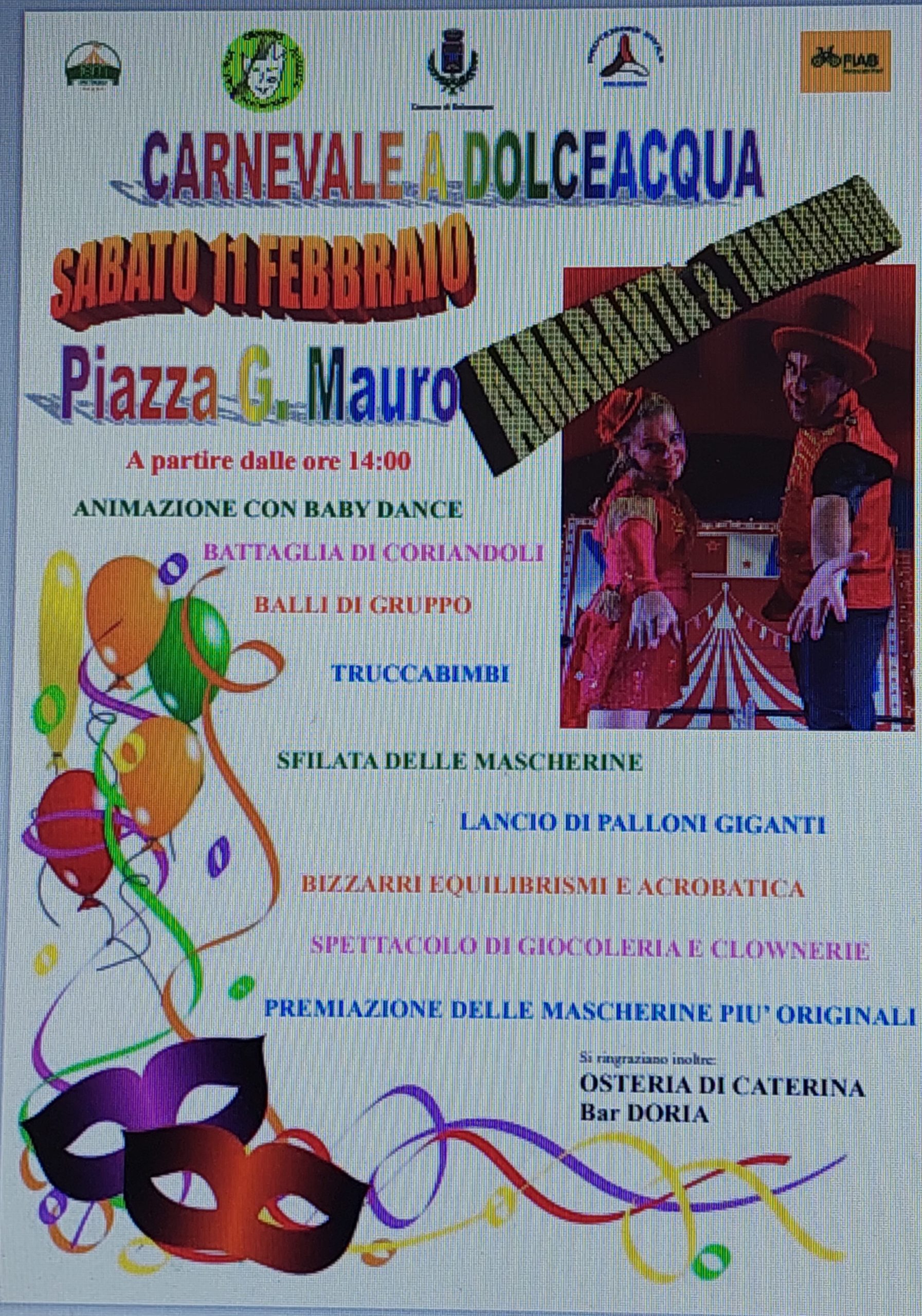 CARNEVALE A DOLCEACQUA SABATO 11 FEBBRAIO IN PIAZZA  G. MAURO A PARTIRE DALLE ORE 14:00