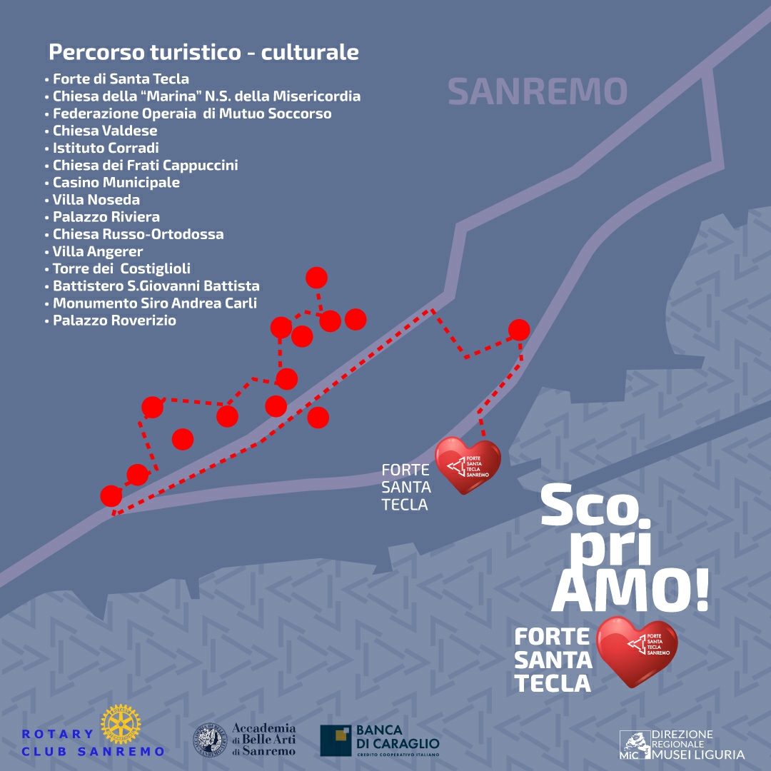 Il progetto nasce dall’esigenza condivisa dal Rotary Club Sanremo con la Direzione regionale Musei Liguria, che gestisce Forte Santa Tecla, di rilanciare il “percorso turistico-culturale” che unisce i più importanti monumenti della città, ideato dallo stesso Club nel 2007 e del quale il Forte è una delle tappe. Il Forte per molti anni, a seguito degli importanti lavori di restauro oggi in parte conclusi grazie ai fondi del Ministero della Cultura, non è mai stato pienamente coinvolto nell’itinerario e non è segnalato dall’apposita targa.