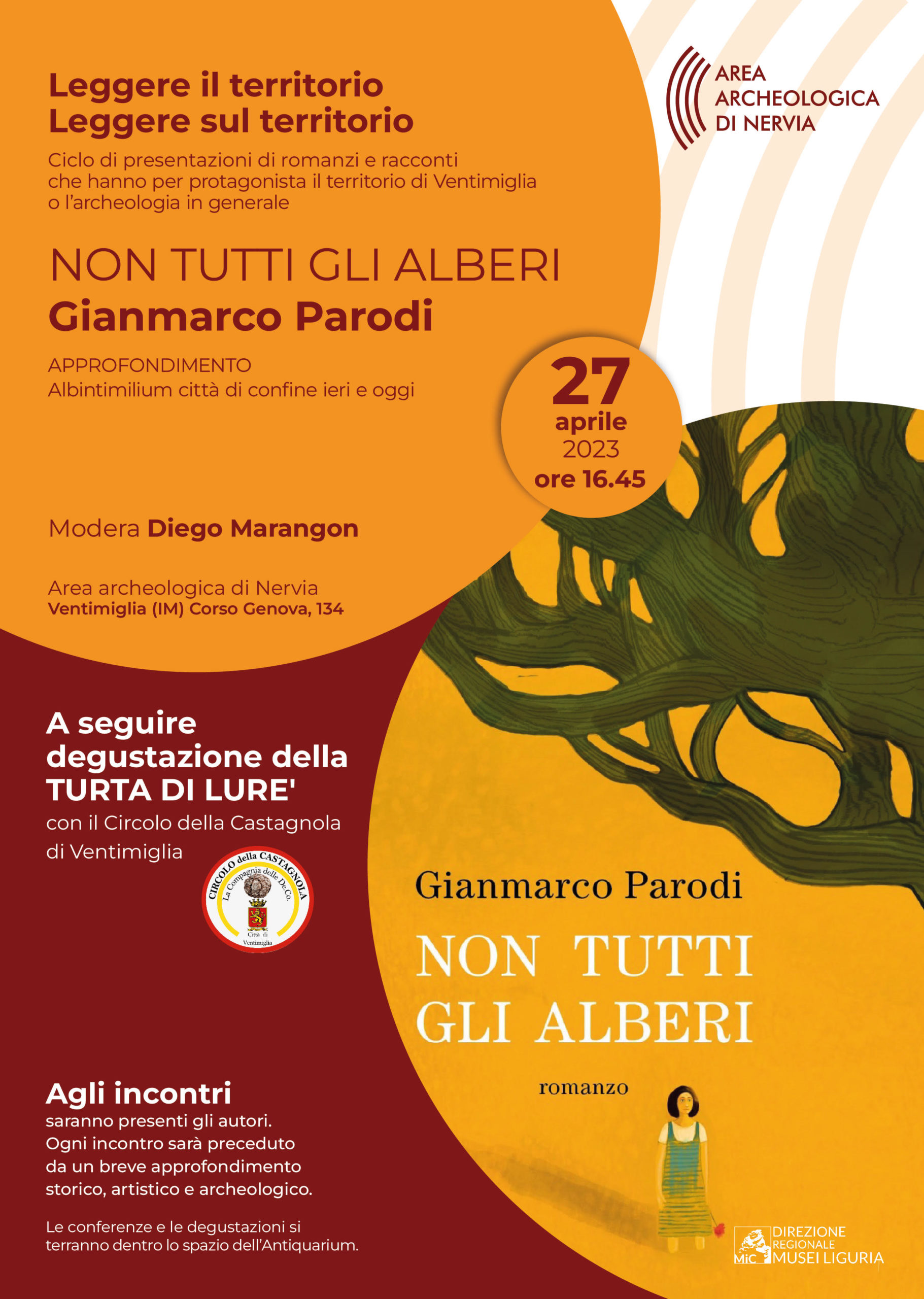 Ospite del nuovo incontro sarà il giovane, ma già affermato e assai conosciuto Gianmarco Parodi che presenterà il suo ultimo lavoro “Non tutti gli alberi” per Piemme editore. Come di consueto, a dialogare con lui sarà Diego Marangon, attore e regista teatrale che da anni si occupa di cultura sul territorio con l’Associazione Culturale LIBER THEATRUM, preceduto da un breve intervento di approfondimento dal titolo “Albintimilium città di confine ieri e oggi” a cura di Giulio Montinari, assistente tecnico archeologico presso l’Area Museale di Nervia. A seguire la altrettanto abituale chiusura dedicata alla valorizzazione dei prodotti enogastronomici locali, questa volta con la degustazione della “Turta di Lurè” a cura del Circolo della Castagnola di Ventimiglia. Il corso è accreditato sulla piattaforma SOFIA del Miur ed è previsto il rilascio di crediti formativi per gli insegnanti.
