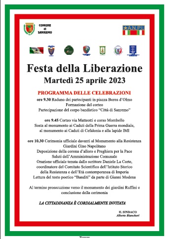 – ore 10.30: cerimonia ufficiale davanti al Monumento alla Resistenza, Giardini Gino Napolitano. Deposizione della corona d’alloro e Preghiera per la Pace. Saluti dell’Amministrazione comunale. Orazione ufficiale dello scrittore Daniele La Corte, coordinatore del Comitato scientifico dell’istituto storico della Resistenza e dell’Età contemporanea di Imperia. Lettura del testo poetico “Banditi” da parte di Gianni Modena