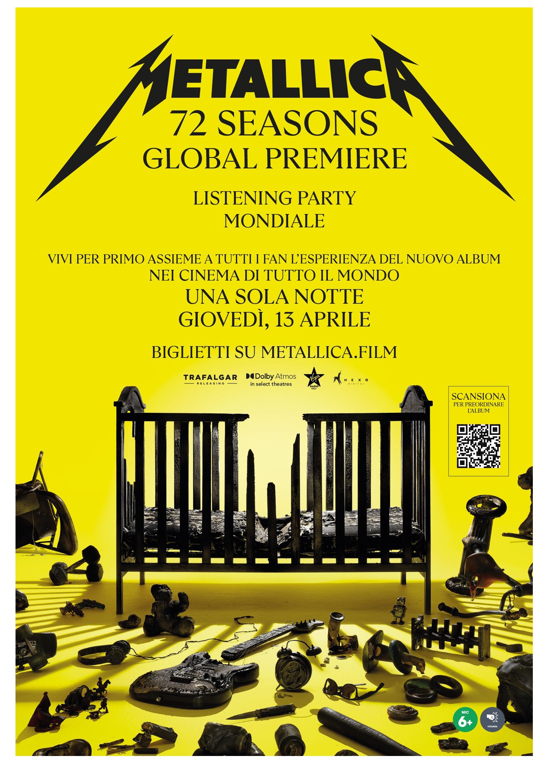 arà il primo listening party del mondo al cinema, per vivere in anteprima assoluta l’esperienza dell’ascolto del nuovo album con video esclusivi e interviste inedite. I Metallica dedicano al pubblico cinematografico di tutto il mondo il loro dodicesimo album in studio, 72 Seasons, per una sola notte, giovedì 13 aprile. Sarà possibile ascoltare integralmente al Cinema Ritz, rispettivamente alle ore 19.00 e 21.30, 72 Seasons con un suono immersivo travolgente: ogni nuova canzone sarà accompagnata da un video musicale e da un commento esclusivo della band. Una serata indimenticabile alla vigilia dell’uscita dell’ album del 14 aprile in un listening party esclusivo.