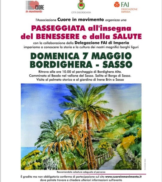 L’Associazione Cuore in movimento, nell’ambito delle iniziative promosse per la prevenzione delle malattie cardiovascolari, organizza una Passeggiata all’insegna del Benessere e della Salute con la collaborazione della Delegazione FAI di Imperia e il patrocinio del Comune di Bordighera. IMPARIAMO A CONOSCERE LA STORIA E LA CULTURA DEI NOSTRI MAGNIFICI BORGHI LIGURI: