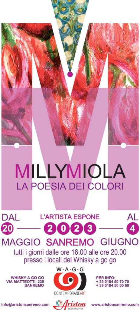 L’artista Milly Miola espone le sue opere a Sanremo in via Matteotti, 230 presso i locali dell’Ariston (Whisky a go go – WAGG Contemporaneart) dal 20 maggio al 4 giugno 2023, tutti i giorni dalle ore ore 16.00 alle 20.00.