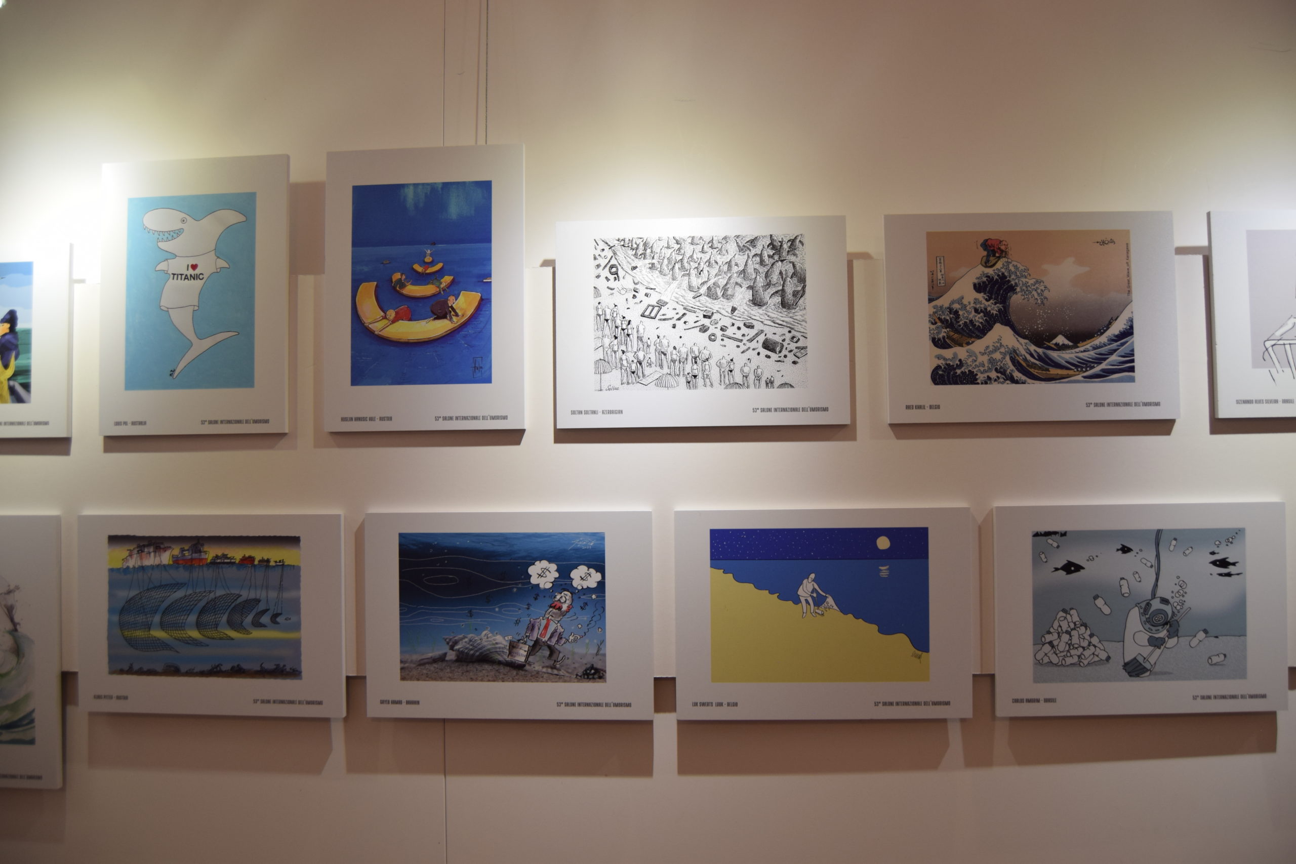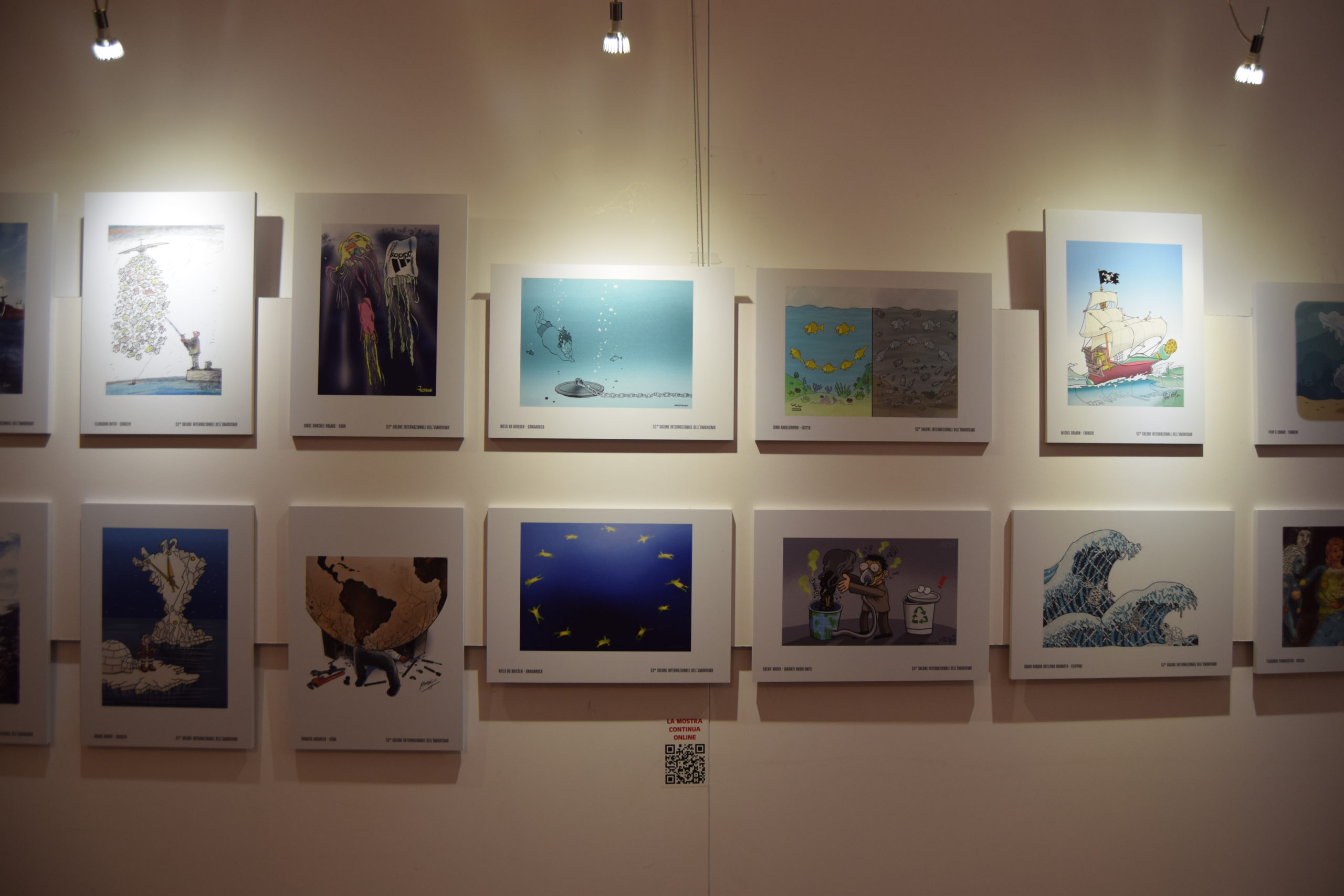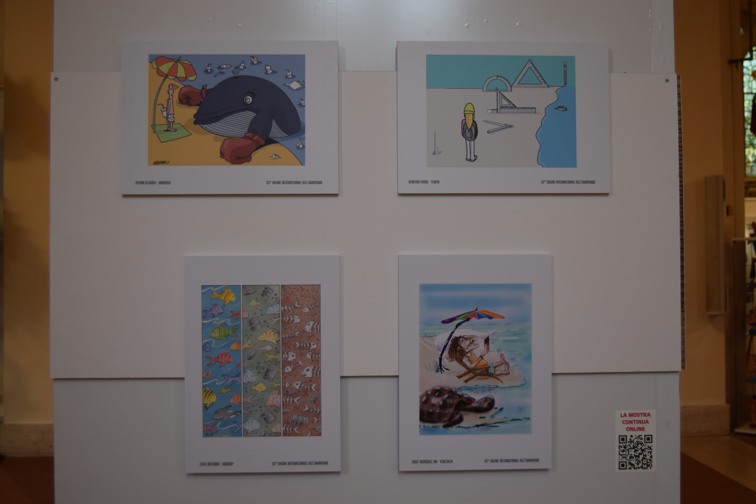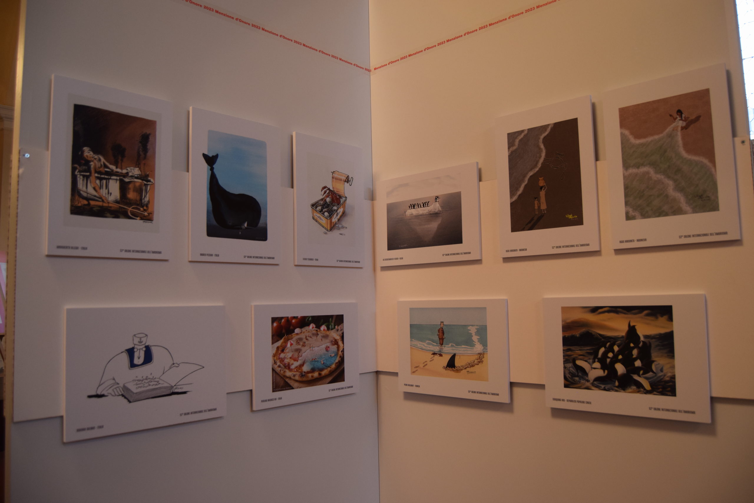 La serie di lavori esposti ci permetterà di ammirare le varie fasi dell’opera del grande maestro dagli inizi alla maturità. IL TEMA FISSO E LA PALMA D’ORO Il tema è MARE, inteso nella sua accezione più ampia: fonte di ispirazione poetica, di viaggi, di scoperte geografiche, di globalizzazioni, di drammi di svago. Al concorso si sono iscritti ca. 400 disegnatori da 61 paesi; i disegni ricevuti 800 ( erano 340 l’anno scorso); un notevole incremento rispetto al 2022, registrato in tutti i continenti (vedi allegato). Dice Paola Biribanti, critica d’arte e giornalista, “Un risultato inaspettato e di grande qualità Il livello di gran parte dei disegni è decisamente alto, per cui unanime è stata la volontà della Giuria di innalzare a dodici il numero dei destinatari della Menzione speciale. Il mare come ambiente inquinato dalle plastiche è risultato il tema più affrontato; seguito dal mare inteso come perigliosa porta di accesso verso una nuova vita, quindi come luogo di vacanza e svago.” =/= Ovviamente il tema MARE non si può esaurire solo con la forza di sintesi del disegno, e cosi abbiamo pensato a scultura e design… Giancarlo Mazzoni, artista scultore, lavora a Bordighera ma le sue opere prendono il largo per mari lontani. I soggetti preferiti sono pesci in metallo ossidato e in legno restituito dal mare. Giancarlo è l’autore della Coda di Capodoglio che si incontra arrivando a Bordighera. Paolo Tonelli, nel suo show-room di Sanremo progetta interni sofisticati e originali, con uno sguardo ai nuovi trend e un solido legame alla tradizione. Paolo ha curato l’allestimento del fondale marino per ospitare i pesci-scultura di Stari Ribar. Paolo Del Bianco artista di Fano, conosciuto per saper creare auto dalle pietre, Dattero d’Oro per il Tema Fisso nel 1994, presenta “Tipi da spiaggia” una collezione di caricature degli stereotipi delle dei fanatici dell’abbronzatura oltre ad un bassorilievo ”NETTUNO È PERFETTO”, divertente caricatura del fondatore del Salone, Cesare Perfetto. =/= Il giardino, animato dai personaggi di famosi umoristi, Mafalda di Quino, gli innamorati di Peynet, la linea di Cavandoli, Cocco Bill di Jacovitti e un clown di Mordillo fa da sfondo ad un nutrito programma che prevede conferenze e presentazioni di libri che avevano vinto nel passato perché il Salone era anche letteratura e non solo disegno.