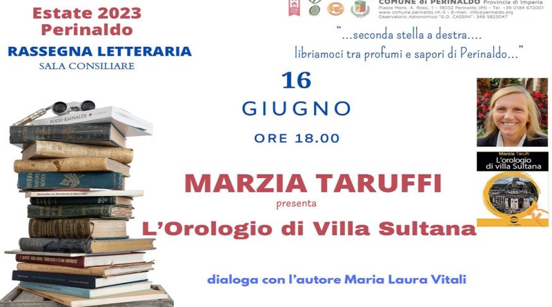 Dopo il felice esordio di venerdì scorso con il partecipato Convegno “Messaggi cifrati in casa Calvino”, la rassegna letteraria “Seconda stella a destra…Libriamoci tra sapori e profumi a Perinaldo”, organizzata dal Comune, prosegue con il secondo appuntamento, in programma venerdì 16 giugno, alle ore 18, nella Sala Consiliare del Comune. Protagonista è la giornalista e scrittrice Marzia Taruffi che presenta la sua ultima pubblicazione “L’orologio di Villa Sultana” (Golem Editore).