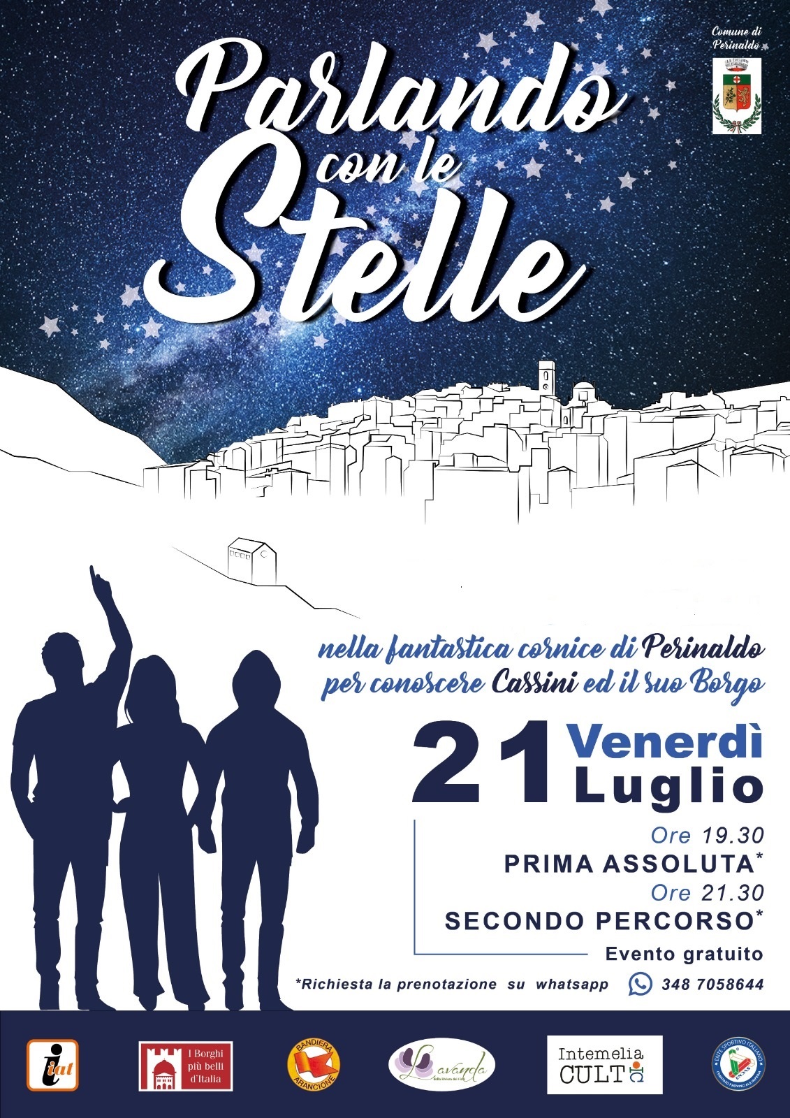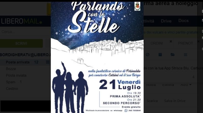 Venerdì 21 luglio a Perinaldo per il primo evento “PARLANDO CON LE STELLE” passeggiata turistica nella fantastica cornice di PERINALDO con lo scopo di far rivivere i personaggi legati al territorio di Perinaldo: l’Astrofisico e Alchimista Gian Domenico Cassini sua moglie Genevieve la regina di Svezia Maria Cristina il Re Sole l’incappucciato la sorella Angela Maria Cassini e la maga esoterica di Perinaldo.