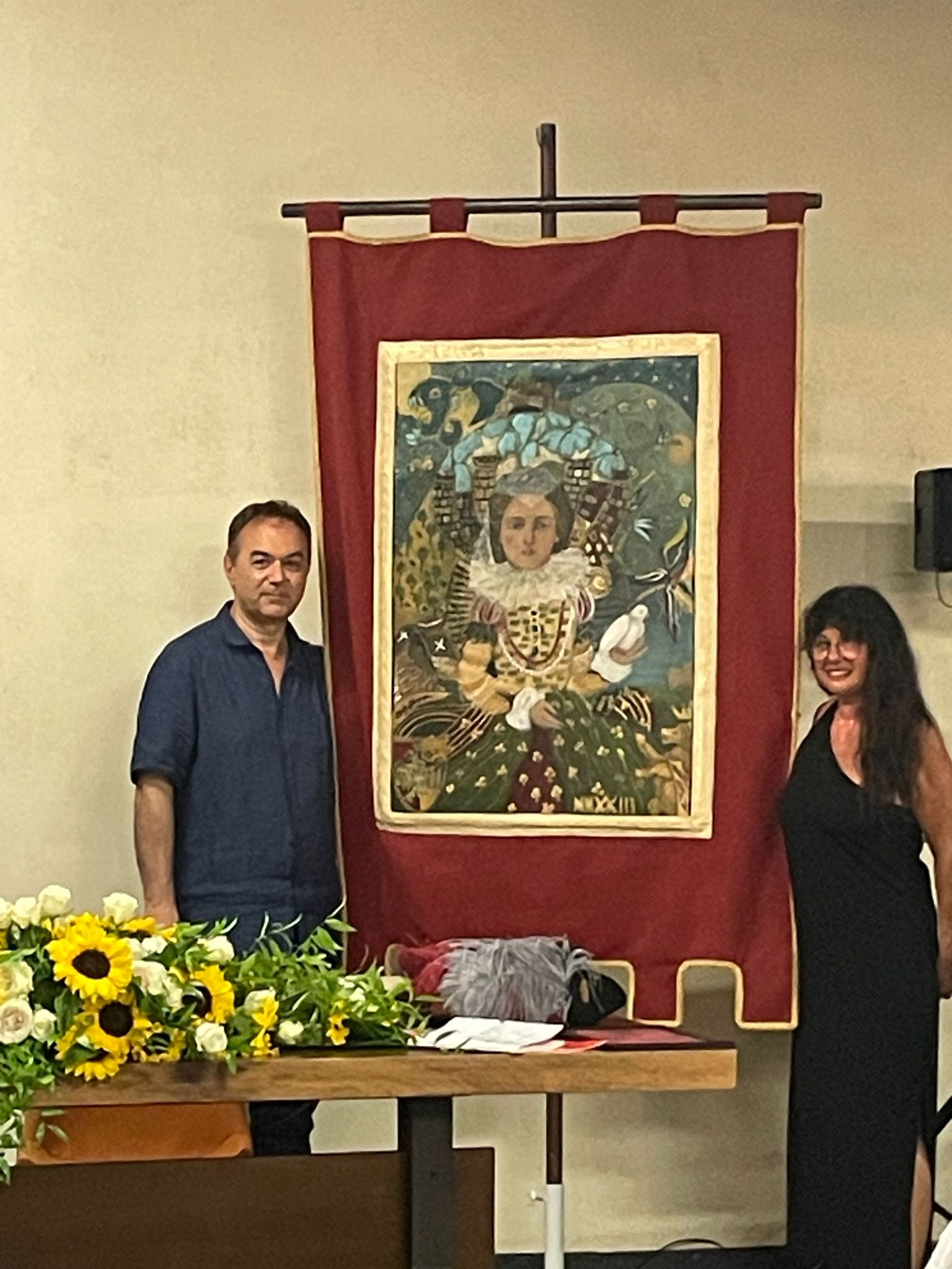 Nell’incantevole cornice del Forte dell’Annunziata, all’interno del MAR, domenica 16 con una cerimonia aperta al pubblico, si è svolto il secondo appuntamento dell’Agosto Medievale 2023 a tema: il Palio Marinaro della disfida – Il Corsaro Nero Signore di Ventimiglia …un abito da scoprire. L’occasione è stata quella di mostrare in anteprima alle Autorità presenti: Vice Sindaco Dott. Marco Agosta, Assessore Turismo Manifestazioni Cultura Sport Dott.ssa Serena Calcopietro, Consigliere Franca Bonadonna; Rappresentanti dei Sestieri e Cittadini, il Palio Marinaro (carbaso) un dipinto su tela, realizzato dall’artista contemporanea francese Cony Shesson, che verrà assegnato al vincitore della regata in programma il prossimo 6 agosto.