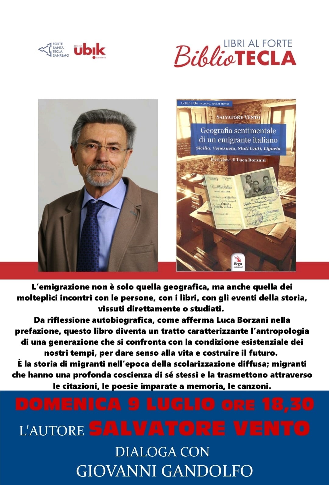 Altre Città Cultura SALVATORE VENTO AL FORTE DI SANTE TECLA PRESENTA IL SUO NUOVO LIBRO 4 Luglio 20235 Luglio 2023 admin Forte di Santa Tecla, Salvatore Vento Domenica 9 luglio alle ore 18.30 presso il Forte di Santa Tecla a Sanremo, Salvatore Vento presenta il suo libro “Geografia sentimentale di un emigrante italiano” La redazione