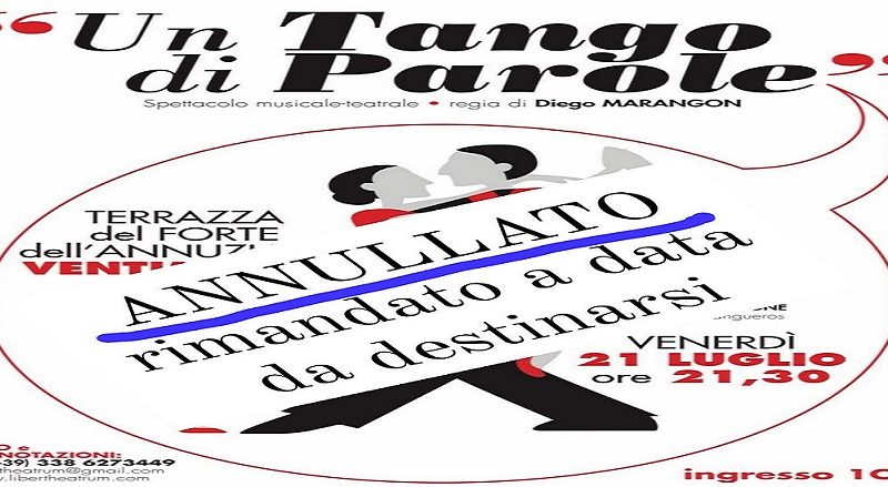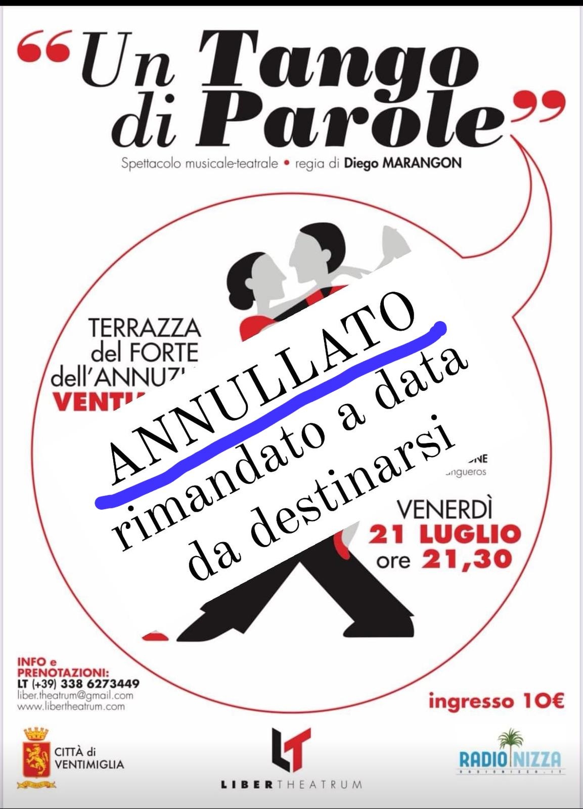A causa di un infortunio subito dalla ballerina, LIBER THEATRUM si vede costretta ad ANNULLARE e rimandare a data da destinarsi lo spettacolo musicale-teatrale “UN TANGO DI PAROLE” in programma VENERDI’ 21 Luglio alle ore 21.15 a Ventimiglia al Forte dell’Annunziata. Gli organizzatori augurano una pronta guarigione all’artista, ed il recupero della serata il più presto possibile.