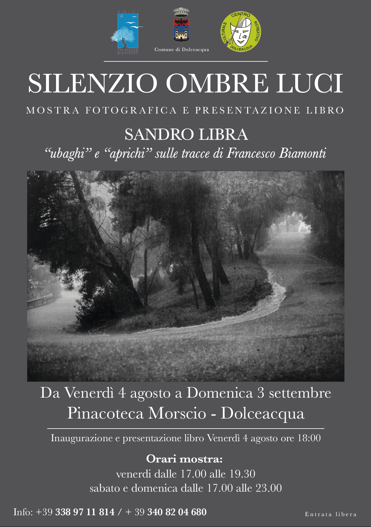 Si svolgerà questa sera alle ore 18, presso la Pinacoteca G. Morscio in via Doria, 10 a Dolceacqua l’inaugurazione della mostra fotografica e la presentazione del libro «SILENZIO OMBRE E LUCI» di Sandro Libra.