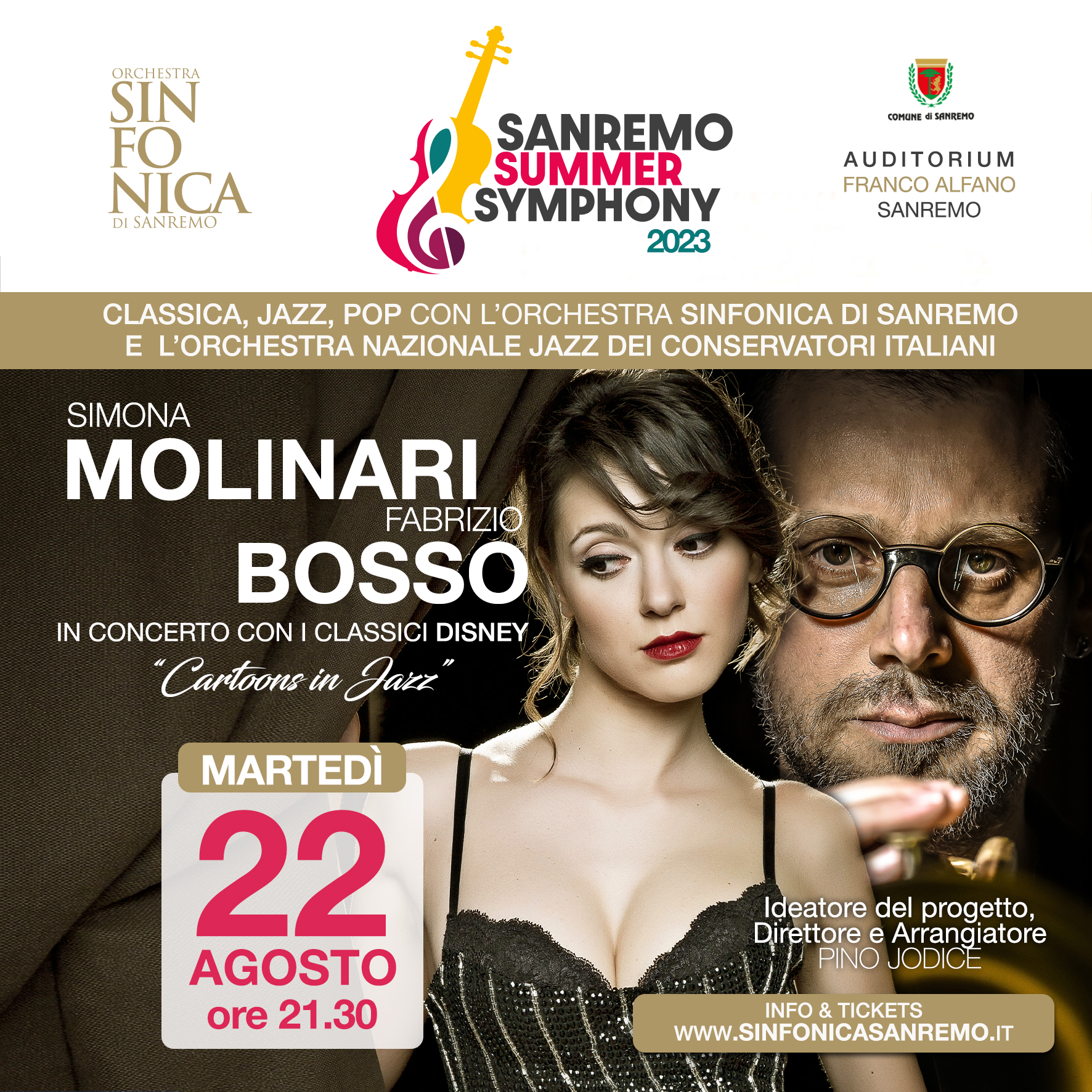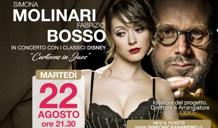 Giancarlo De Lorenzo, direttore della rassegna racconta: “Il primo appuntamento sarà domani, 22 agosto alle 21.30, con “Cartoons in Jazz”. Si tratta di una rielaborazione jazzistica delle più famose colonne sonore dei grandi classici di Walt Disney. Un progetto ideato e arrangiato dal grande pianista jazz, compositore, arrangiatore e Direttore d’Orchestra pluripremiato Pino Jodice. Un concerto nato nel 2005 che ha abbracciato la standing ovation di oltre 5000 persone tra pubblico e critica registrando ovunque soldout. Un serata adatta a grandi e piccoli. In scaletta ci sono brani che hanno accompagnato l’infanzia di tante generazioni… E poi sul palco, con l’Orchestra Sinfonica di Sanremo, due artisti straordinari: Simona Molinari, eccellenza assoluta per vocalità e interpretazioni e Fabrizio Bosso, trombettista di livello internazionale che ha portato la sua musica in giro per il mondo”.