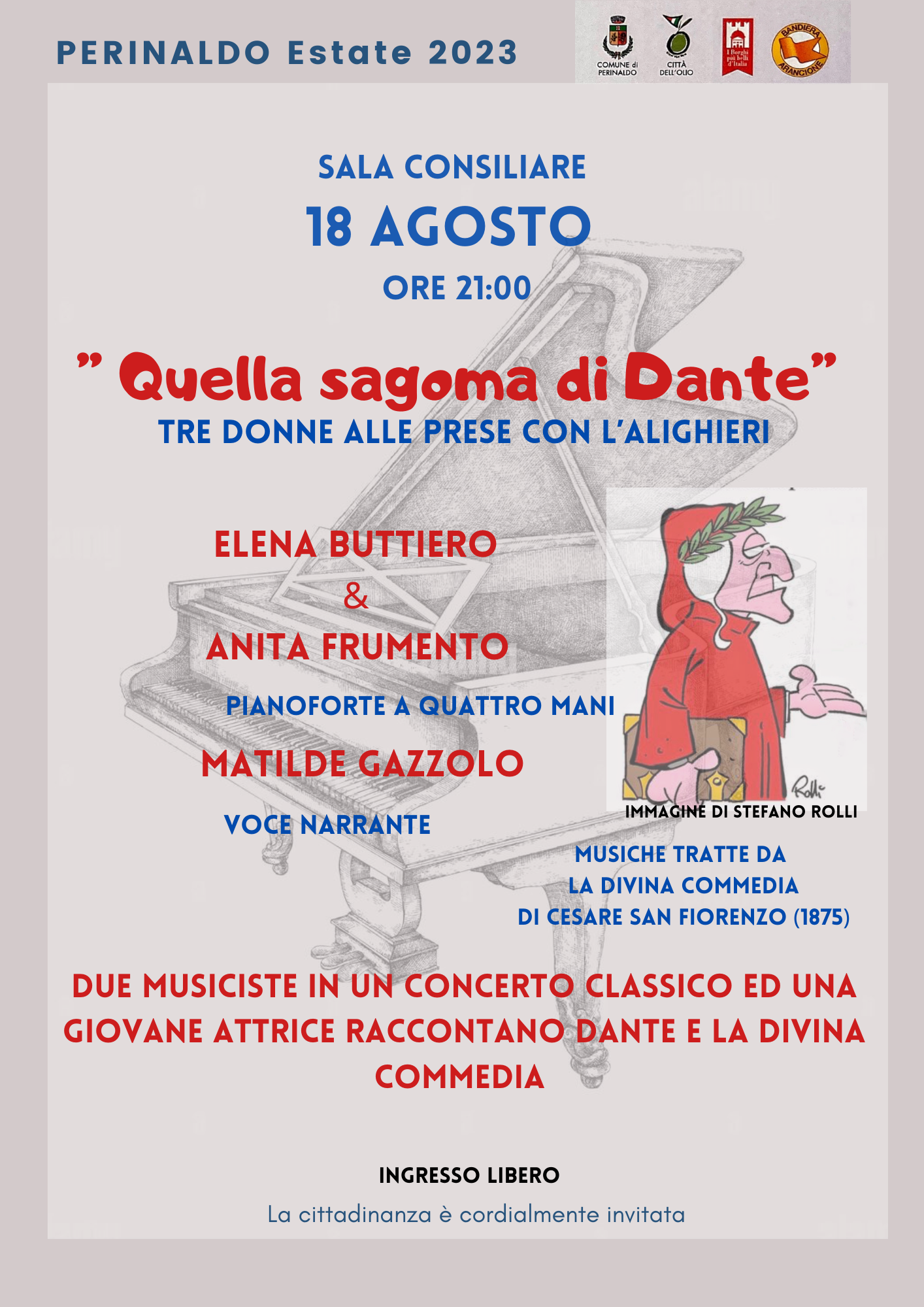 S’intitola “Quella sagoma di Dante. Tre donne alle prese con l’Alighieri” lo spettacolo (una produzione Associazione Allegro con Moto di Savona) fatto di teatro – tutto da ridere – e musiche bellissime che avrà luogo venerdì 18 agosto alle ore 21:00, presso la Sala consiliare del Comune. In scena ci saranno un’attrice, Matilde Gazzolo e due pianiste, Elena Buttiero e Anita Frumento. Sono loro le tre donne che hanno a che fare con Dante. Ma non sono sole. Ci sono anche Beatrice, Francesca da Rimini, Piccarda Donati, Pia de’ Tolomei, Gemma Donati. Tutte le donne di Dante, insomma.