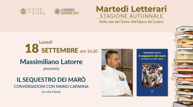 La stagione autunnale dei Martedì Letterari del Casinò di Sanremo si apre con un caso che ha interessato direttamente anche la città di Sanremo, che ha espresso solidarietà verso la vicenda umana dei due Marò: Massimiliano Latorre e Salvatore Girone, accusati nel 2012 di aver causato la morte di due pescatori indiani. Massimiliano Latorre a dieci anni di distanza e dopo l’assoluzione, conversando con Mario Capanna, ripercorre una parte del suo vissuto cercando di evidenziare fatti, sentimenti e persone determinanti nella sua esperienza personale e professionale.