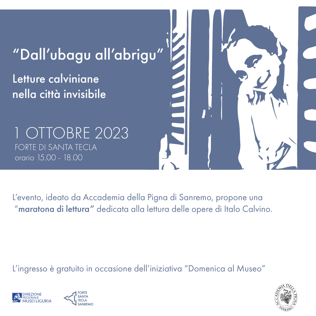Per celebrare il centenario di Italo Calvino il Forte di Santa Tecla domenica primo ottobre dalle 15 alle 18 propone “๐๐๐ฅ๐ฅโ๐ฎ๐๐๐ ๐ฎ ๐๐ฅ๐ฅโ๐๐๐ซ๐ข๐ ๐ฎ – ๐ฅ๐๐ญ๐ญ๐ฎ๐ซ๐ ๐๐๐ฅ๐ฏ๐ข๐ง๐ข๐๐ง๐ ๐ง๐๐ฅ๐ฅ๐ ๐๐ข๐ญ๐ญ๐ฬ ๐ข๐ง๐ฏ๐ข๐ฌ๐ข๐๐ข๐ฅ๐โ maratona di lettura a cura dell’Accademia della Pigna di Sanremo.