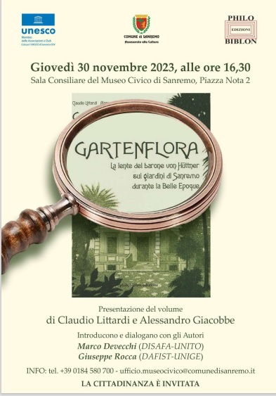 Il Club per l’Unesco di Sanremo continua con successo le attività culturali con la presentazione del libro “Gartenflora. La lente del barone von Hüttner sui giardini di Sanremo durante la Belle Époque” (philobiblon edizioni) sabato 30 novembre alle 16.30, nella sala consiliare del museo civico di Palazzo Nota (assessorato alla cultura)