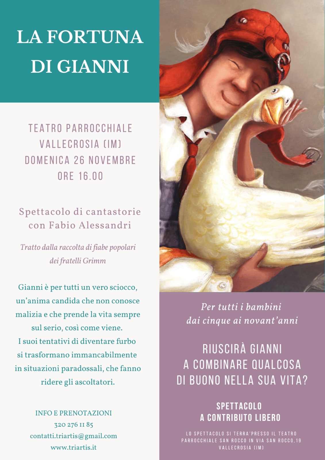 Domenica 26 novembre 2023 alle ore 16.00 nel Teatro parrocchiale San Rocco di Vallecrosia, Fabio Alessandri, burattinaio e cantastorie, intratterrà i bambini con uno spettacolo teatrale dedicato a loro e non solo.