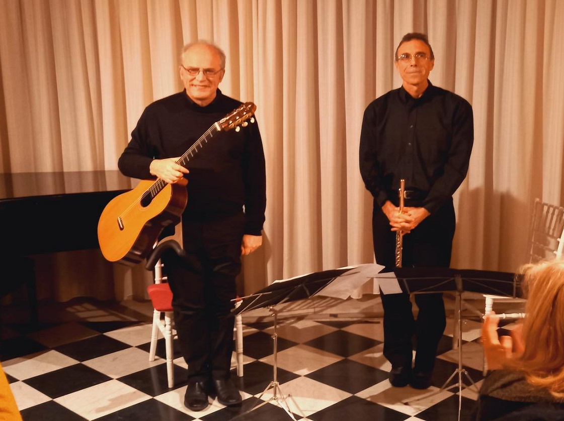 Il Duo Novecento, Gianluca Nicolini al flauto e Fabrizio Giudice alla chitarra  hanno catturato il pubblico con un’esecuzione brillante e coinvolgente in un programma particolare e raffinato, “Dal Classicismo al Tango”, mettendo in evidenza un solidissimo affiatamento e doti musicali di alto livello subito espressi nel “Gran Duo concertante” di Mauro Giuliani, pagina estroversa e di sapiente fattura strumentale in un perfetto gioco sonoro di equilibri melodico – timbrici messi ben in evidenza dal Duo Novecento con eleganza e ricchezza di suono. L’esecuzione della “Sonatina” di Mario Castelnuovo -Tedesco, capolavoro del repertorio cameristico del ‘900, ha suggellato ancora di più l’intesa perfetta di flauto e chitarra piacevolmente immersi in un gioco di rimandi fra la tradizione neoclassica e il modernismo attento e consapevole del compositore fiorentino.