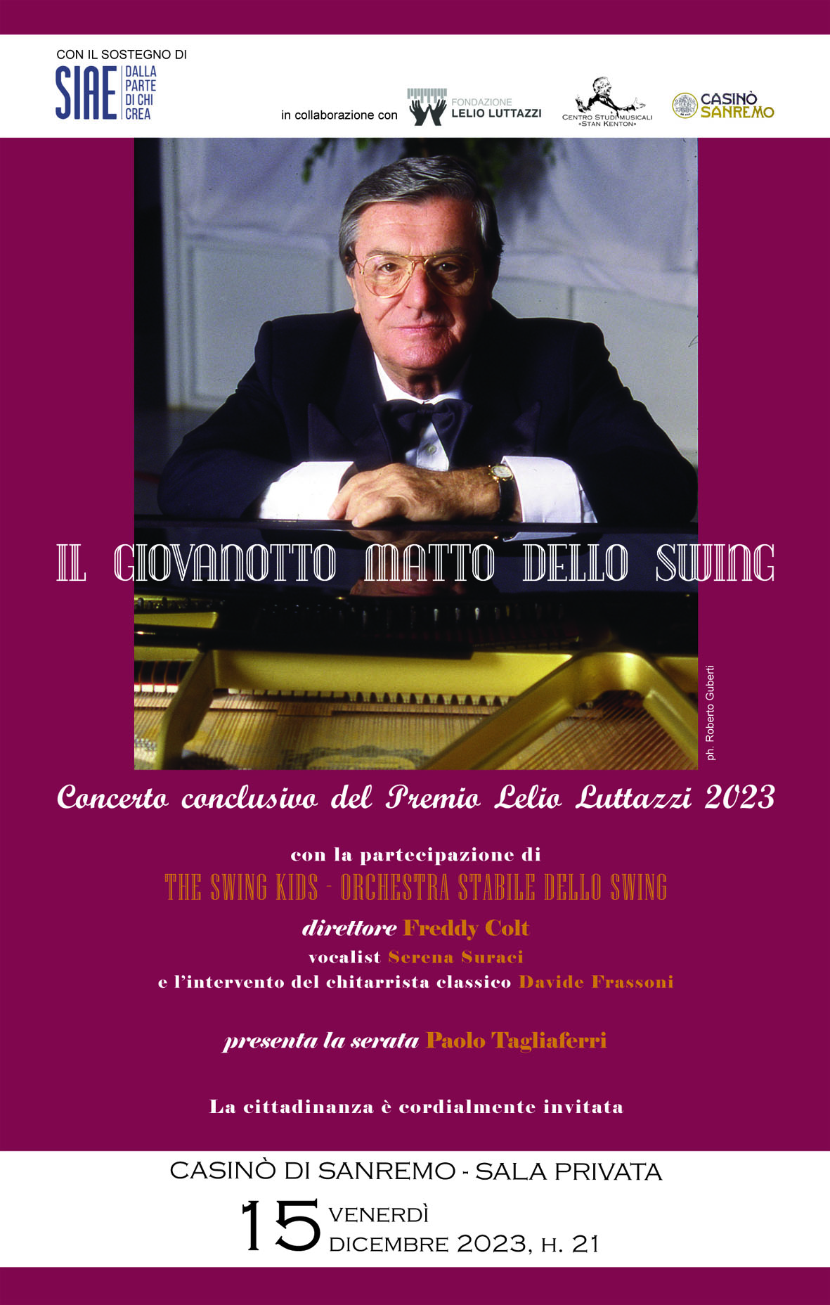 Venerdì 15 dicembre al Casinò di Sanremo (Sala Privata, ore 21, presenta Paolo Tagliaferri) una serata speciale a conclusione del Premio Lelio Luttazzi 2023, con la partecipazione di Swing Kids, Orchestra Stabile dello Swing, formata dai migliori giovani talenti del jazz e diretta da Freddy Colt, con la vocalist Serena Suraci e l’intervento del chitarrista classico Davide Frassoni. Arrangiamenti del Maestro Lelio Luttazzi e del Maestro Antonello Capuano.